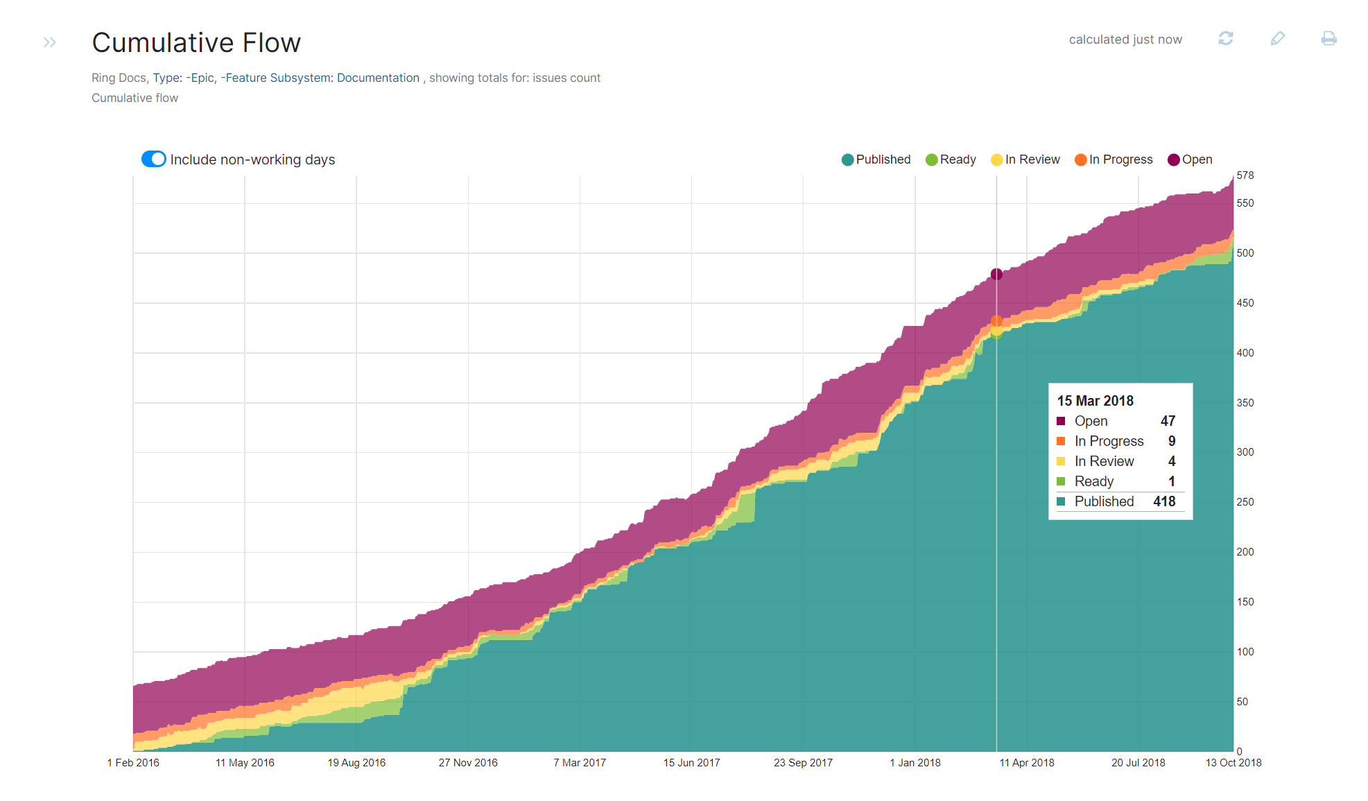 Here is the same report modified to hide the values for the Open and Fixed, showing only intermediary states: