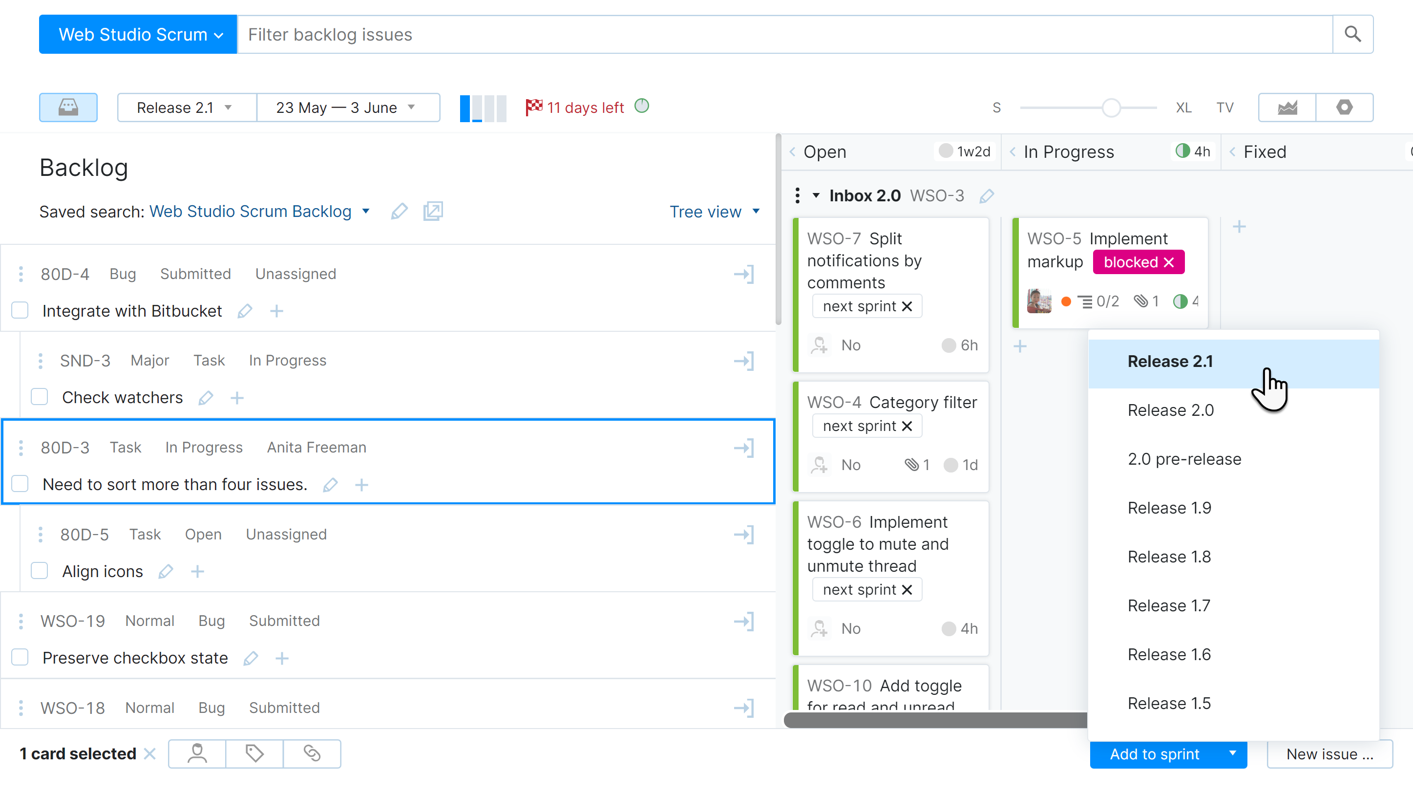 button to view the backlog.Drag cards from the backlog to the board, or select one or more issues in the backlog and add them to the current sprint: