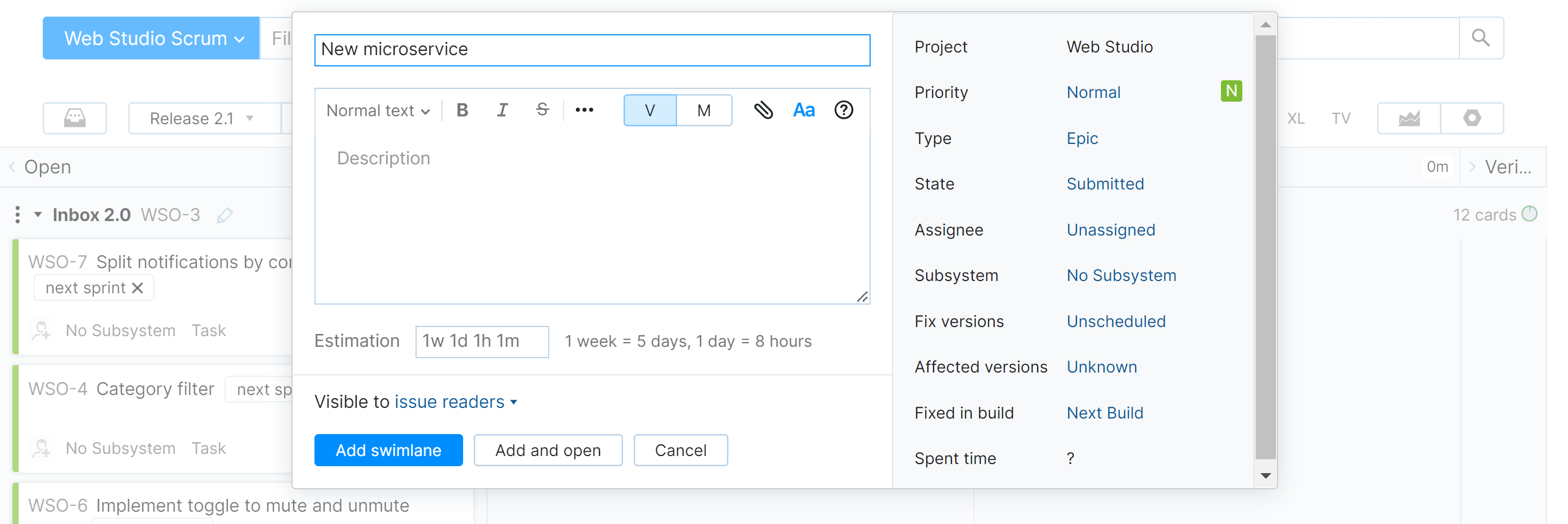 Click the Add swimlane button to add the issue as a swimlane to the current sprint. If you want to add more information to the issue after its creation, click the Add and open button. In this case, the issue is added as a swimlane to the current sprint and opens in view mode.
