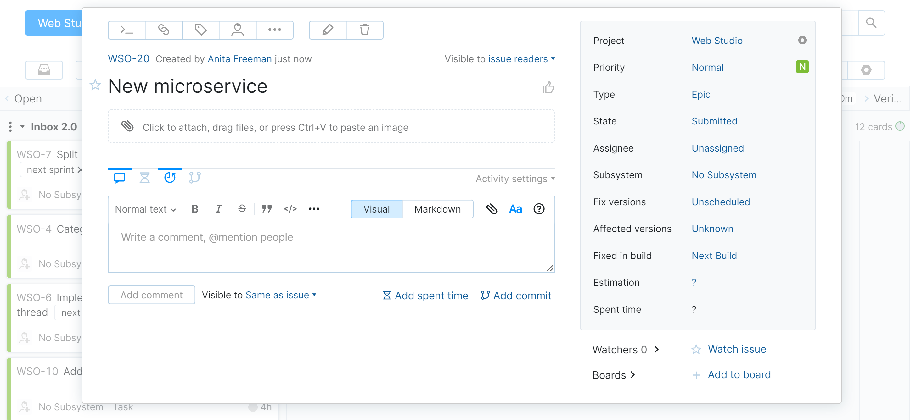 The project field is also set automatically. If you manage multiple projects on the board, the first project in the list is assigned to the issue.