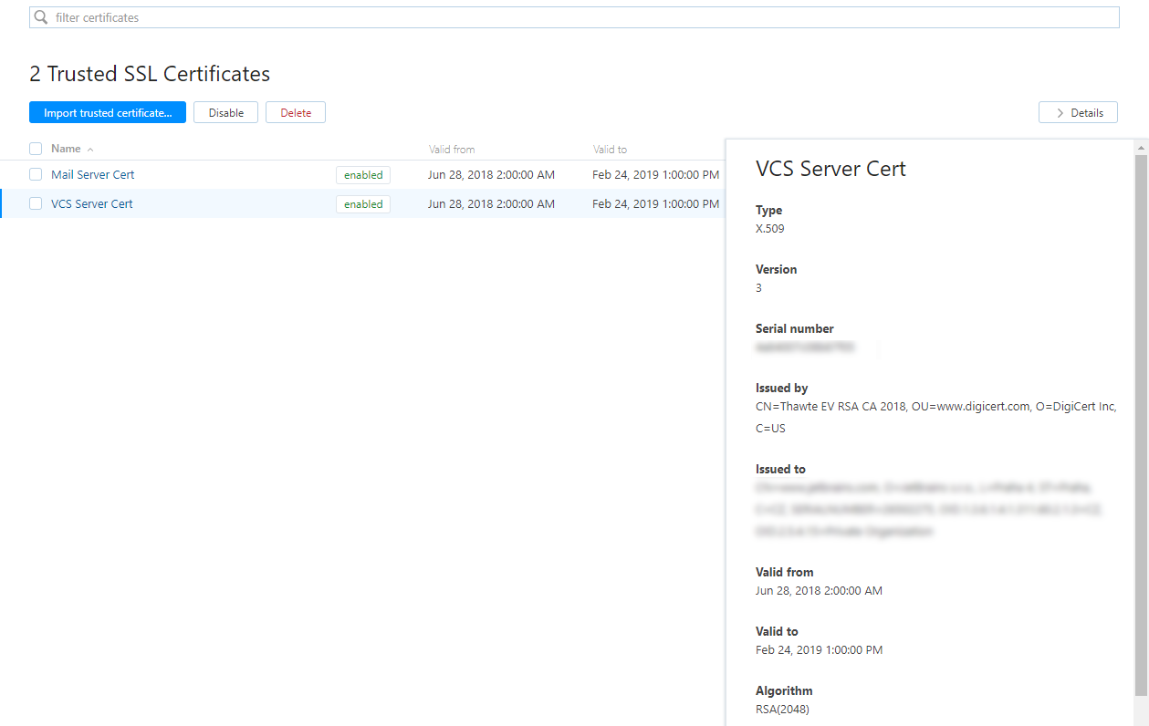 When YouTrack tries to establish a connection with a third-party server for which it does not have a certificate, the connection is not established. This situation occurs when a new certificate has been issued for the service that has not been imported to YouTrack. YouTrack stores this certificate in an untrusted state. If you recognize the certificate source and want to re-establish the connection, you can change the status of the certificate to trusted.
