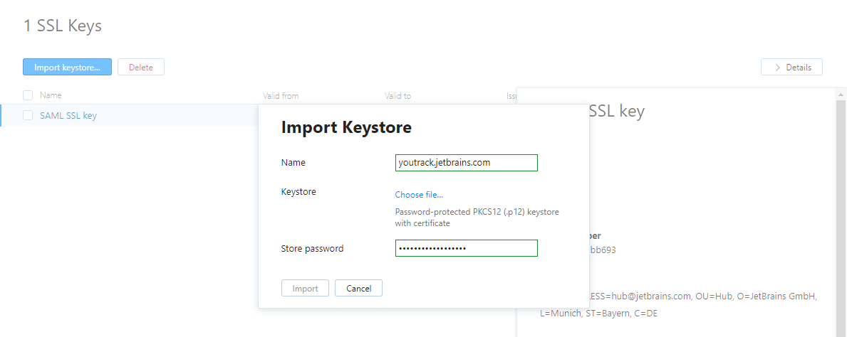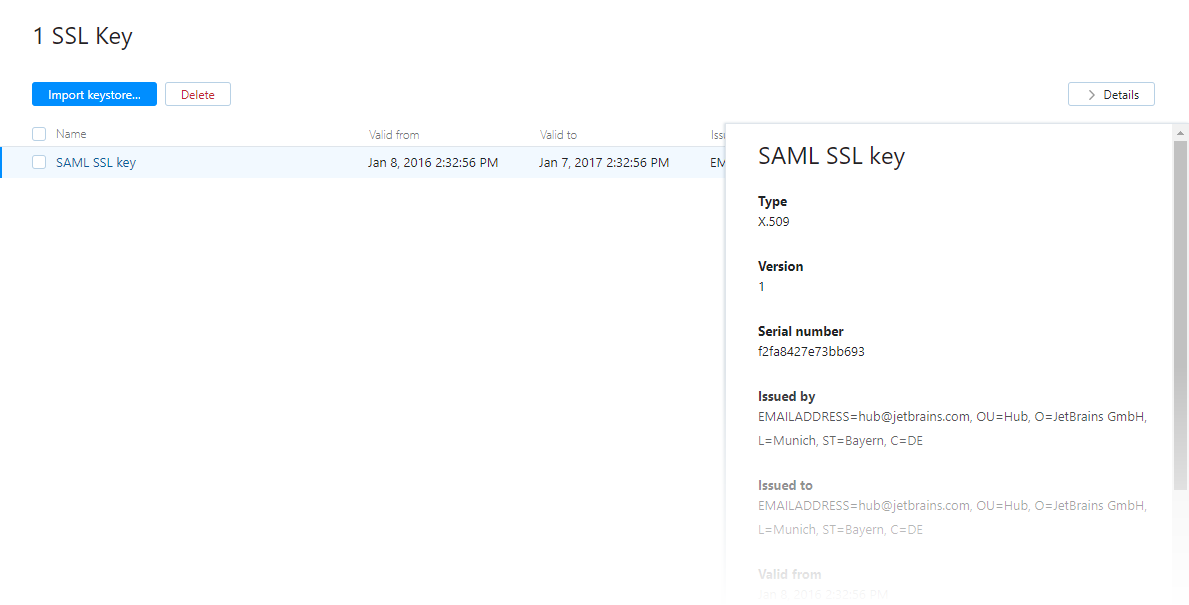 Delete | Click the Delete button to remove a key from YouTrack. Use this option to remove keystores that contain certificates that are expired or no longer in use. |