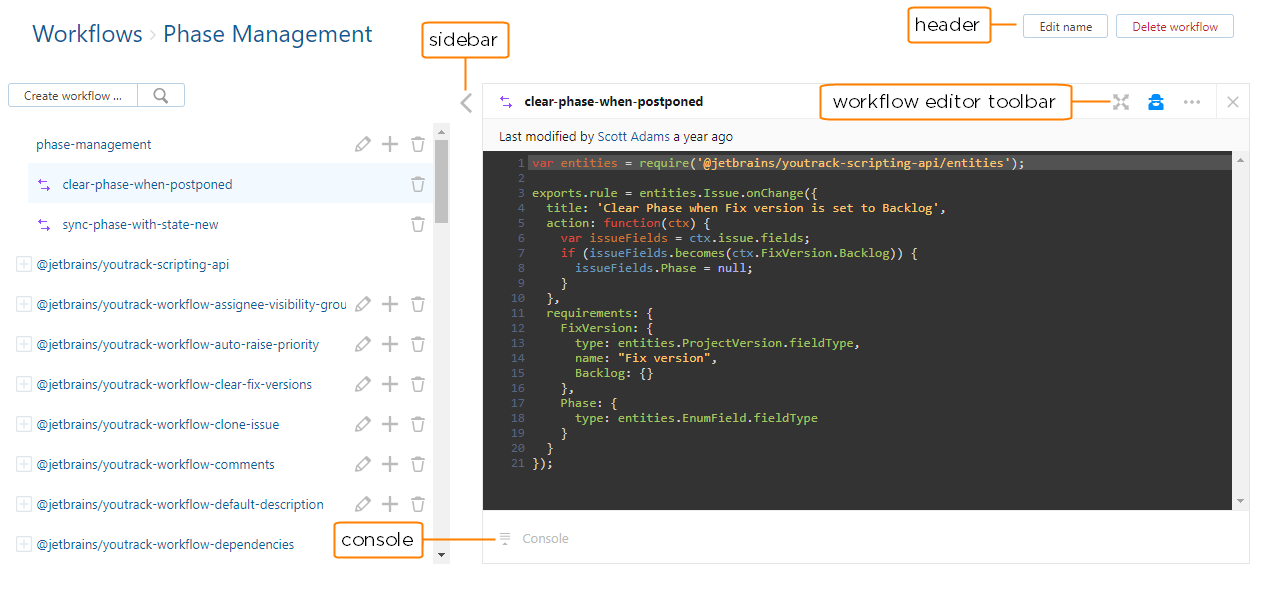 If you prefer to write your code in an integrated development environment, you can still use an external editor that supports JavaScript and import your workflows into YouTrack.
