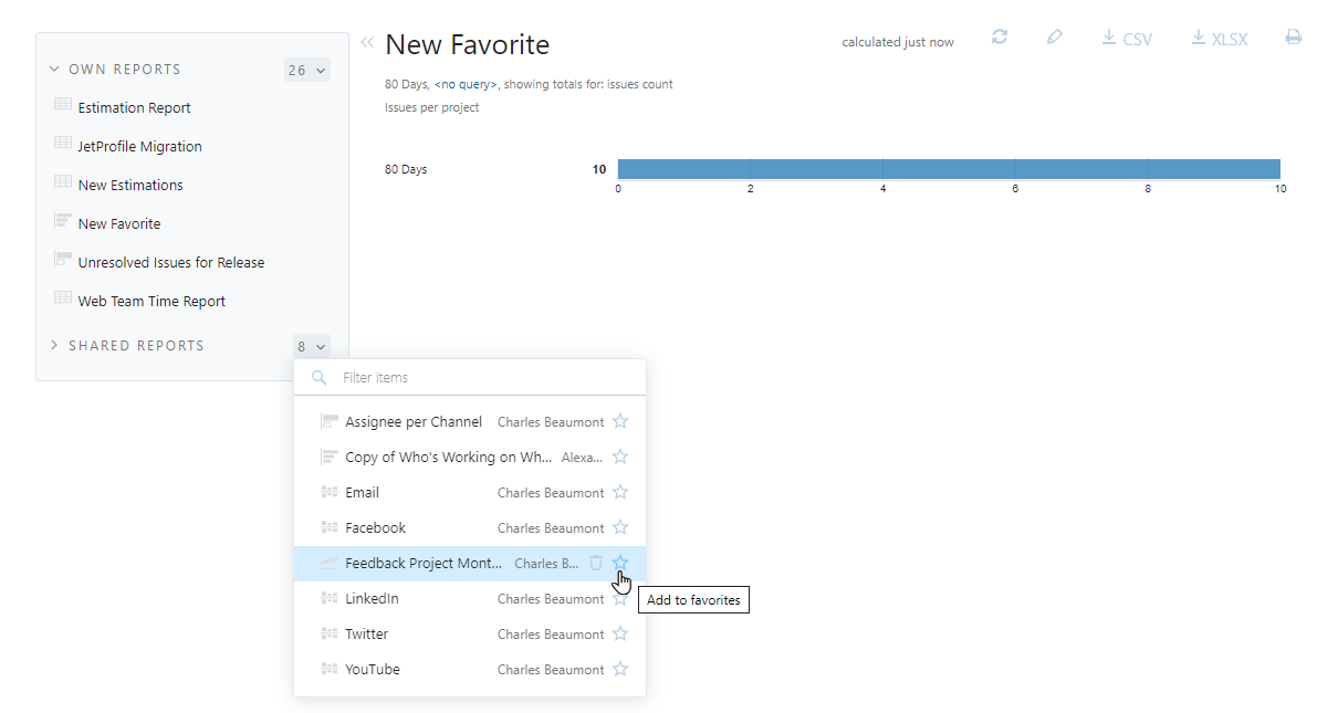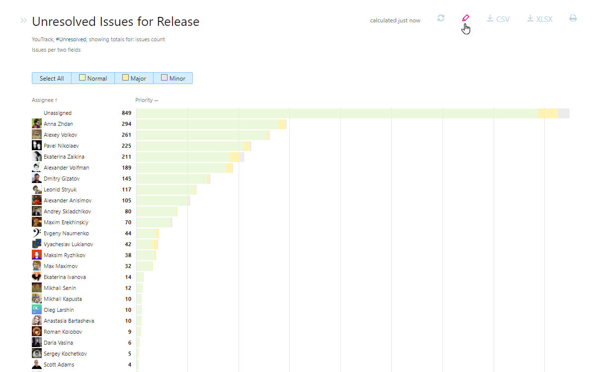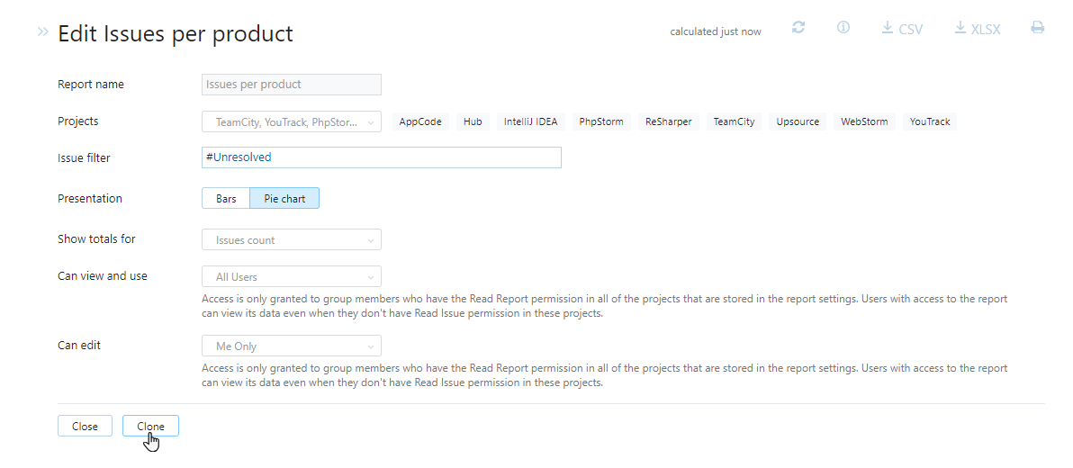 YouTrack lets you configure the visibility of a report so you can share it with your colleagues. By default, a new report is only visible for the person who created it, its owner.