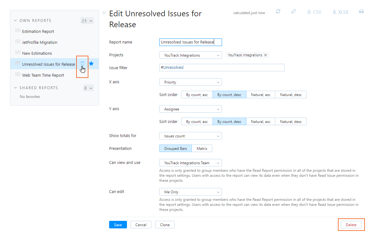 Alternatively, you can open the report in Edit and click the Delete button in the bottom-right corner of the page.