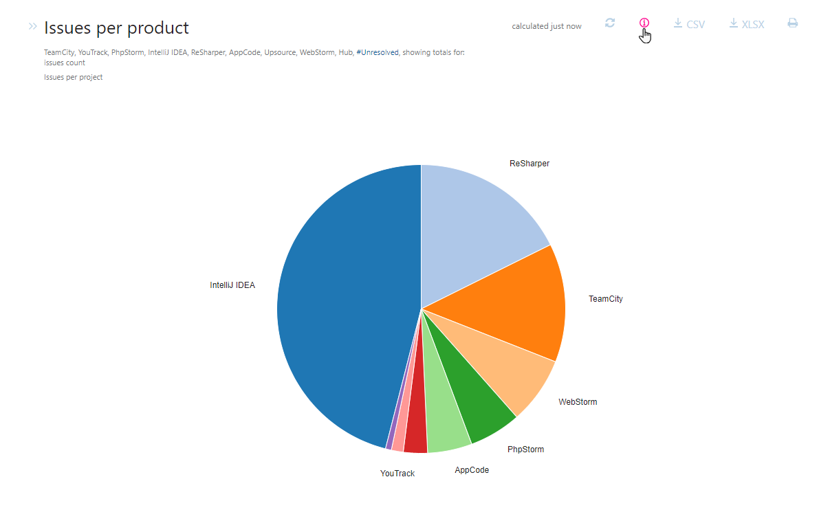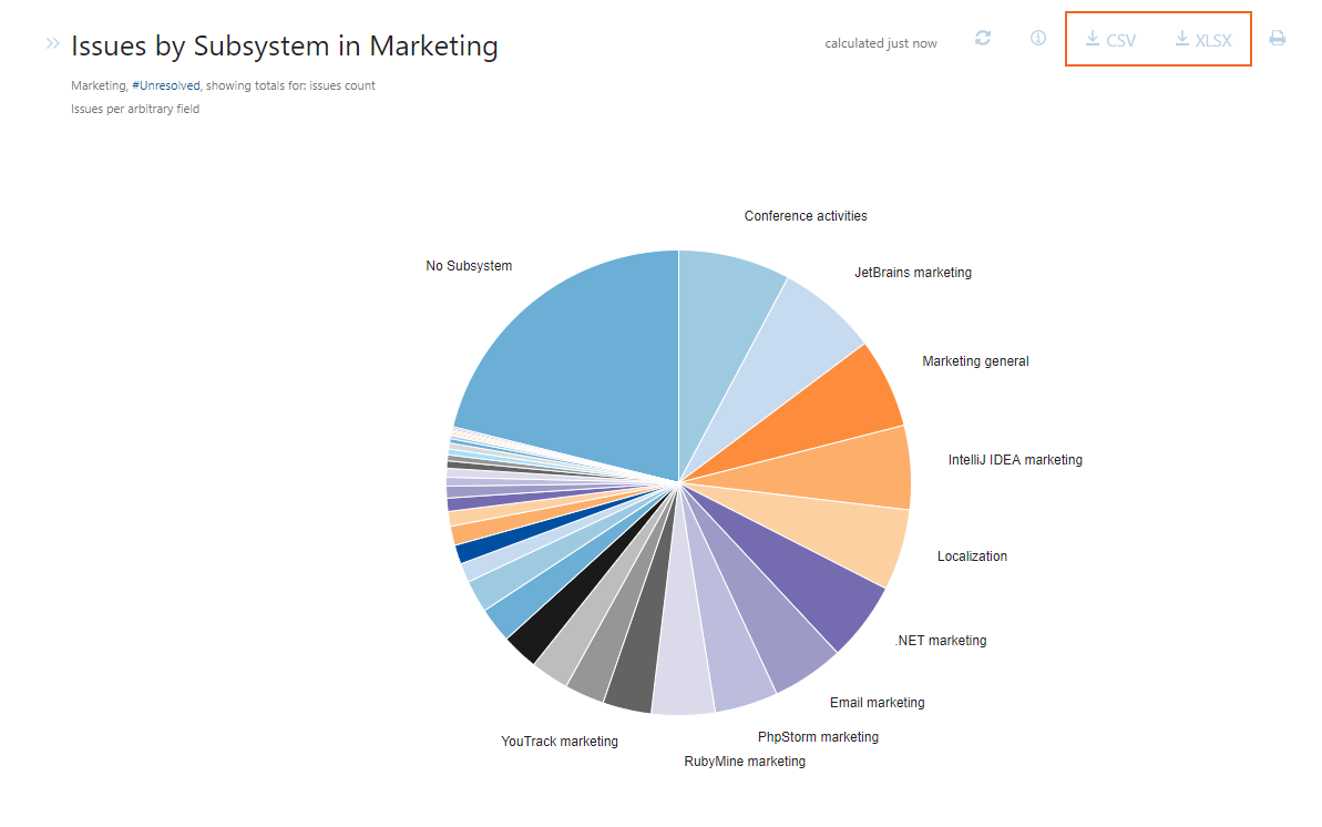 YouTrack lets you download the data from a calculated report. Different options in the report header let you export the data as a CSV or Microsoft Excel file.