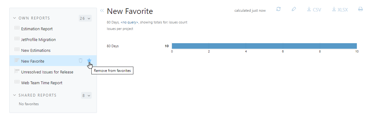 By default, each new report that you create is added to your list of favorites. If you want to hide reports that you don't work with often, you can remove them from your favorites. You can still access the report at any time from the Show more list.