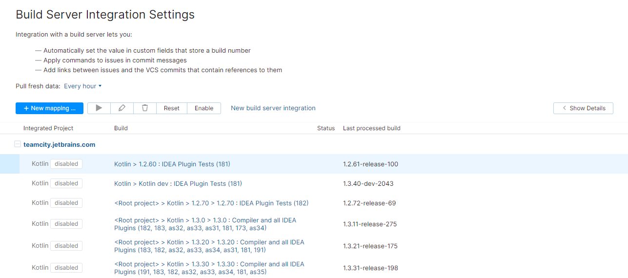Run | Pulls fresh data from the build server for the selected project. Links to builds are added to issues in YouTrack based on the current integration settings. Commands in VCS commit messages are applied to the corresponding issues. Build numbers are added to issues according to the options that are defined in the mapping. The last processed build is updated in the corresponding column on the integration settings page. |