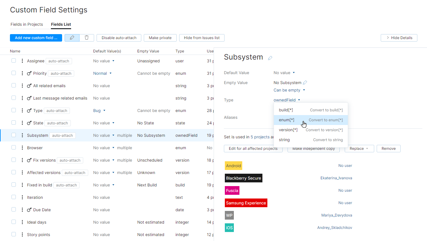 You can convert an issue field type to another type that stores similar data. The following field type conversions are supported: