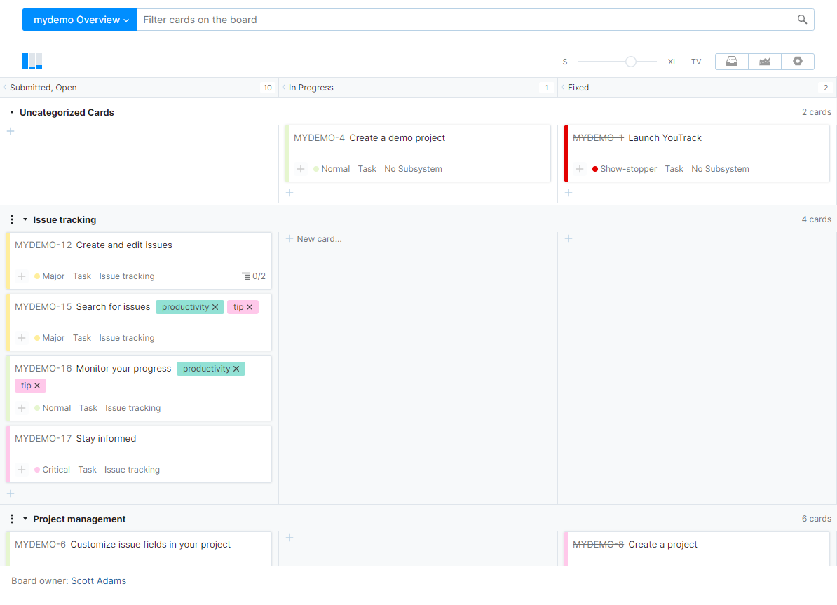 The demo project contains a preconfigured set of sample issues that help you become more familiar with key features in YouTrack. The demo project also includes a collection of agile boards, reports, and a dashboard.