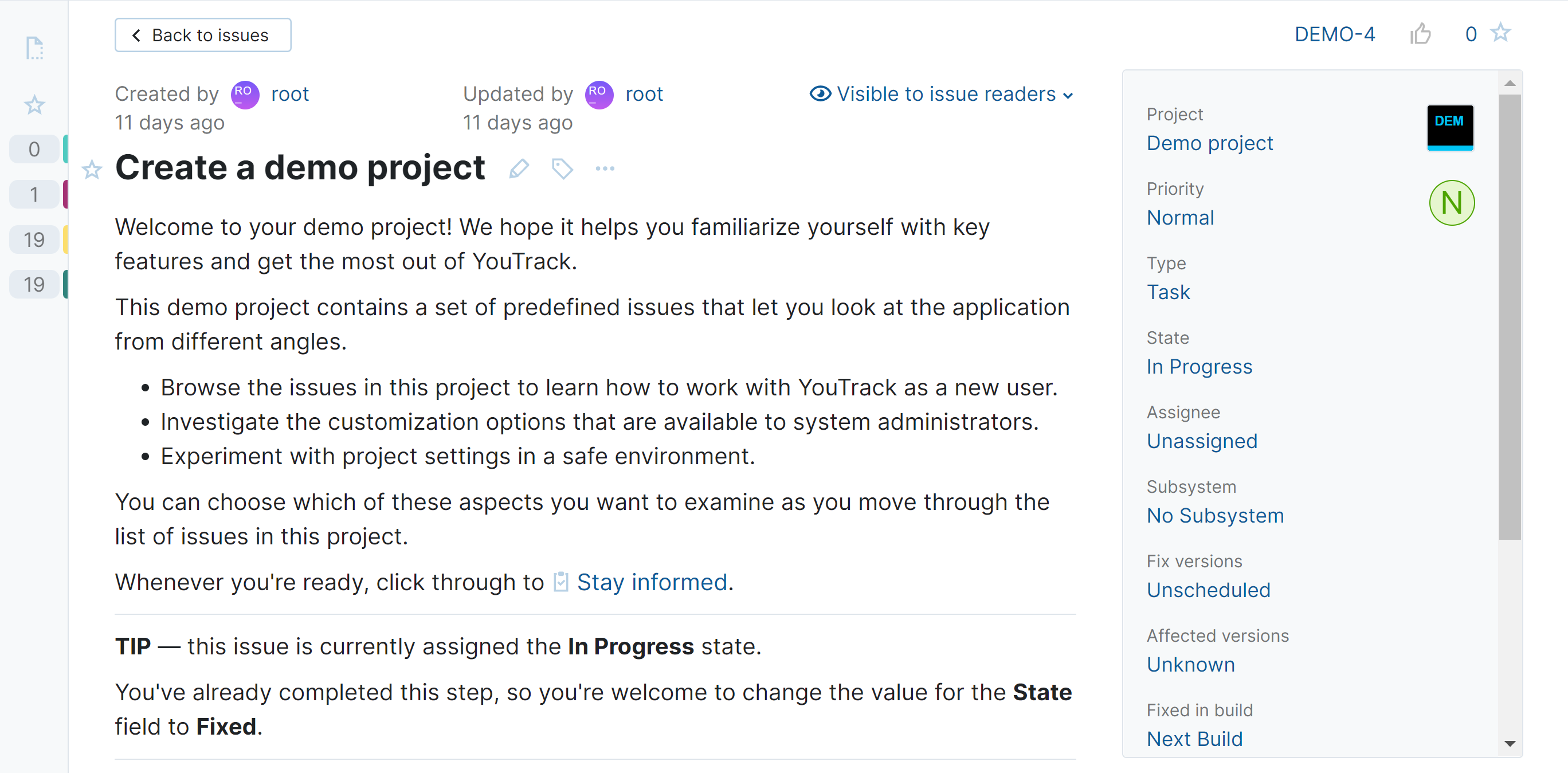 If you're evaluating YouTrack as a potential solution for managing projects in your organization, use the demo project to get first-hand experience with a range of features with minimal downtime for setup and configuration.