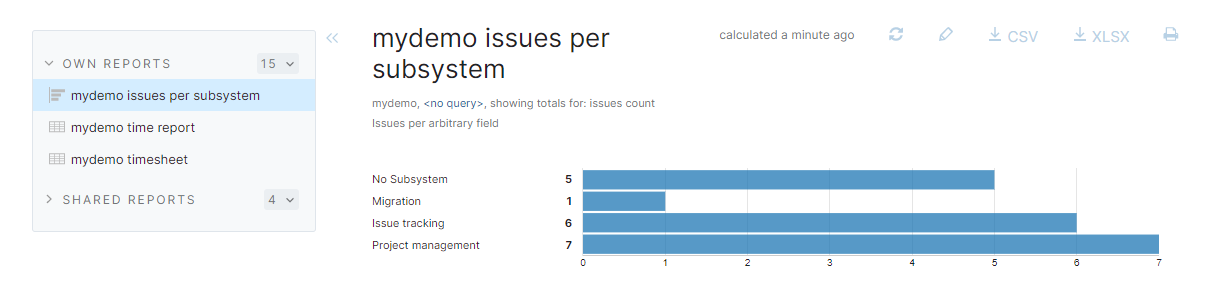 The first report shows you how many issues are assigned to each of the subsystems that are used in the demo project. This type of report helps teams decide which aspects of a particular project require the most attention at any given time.