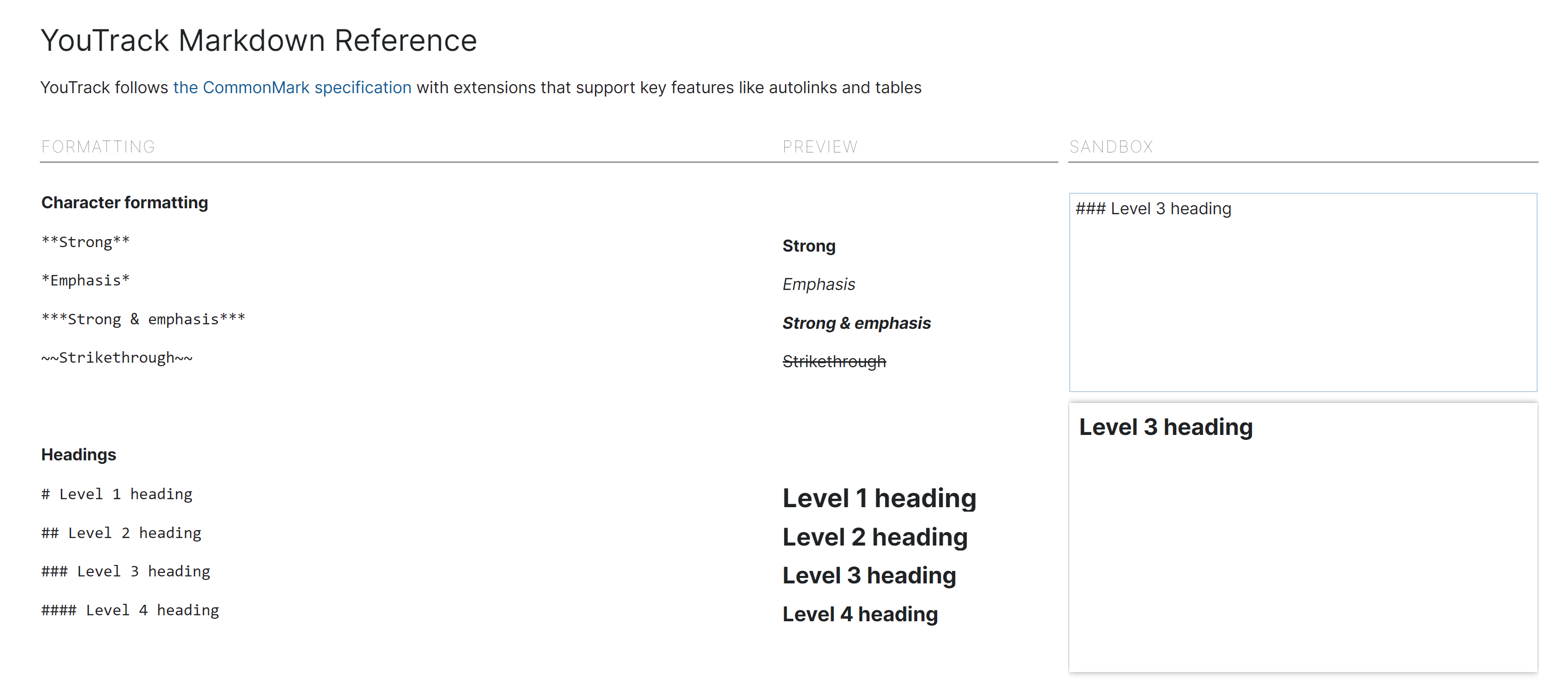 When you click an item in the Formatting column, the example is copied to the Sandbox section of the page. Here, you can experiment with additional formatting options. When you're satisfied with the result, copy the content with markup from the sandbox and paste it into an issue or article.