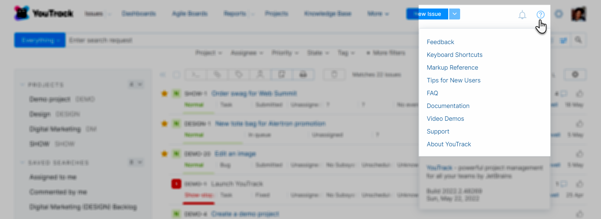 The Help menu in YouTrack gives you direct access to resources that are designed to answer your questions about the product and get the most from the application. By familiarizing yourself with the resources available to you, you'll know exactly where to go for help when you need it.