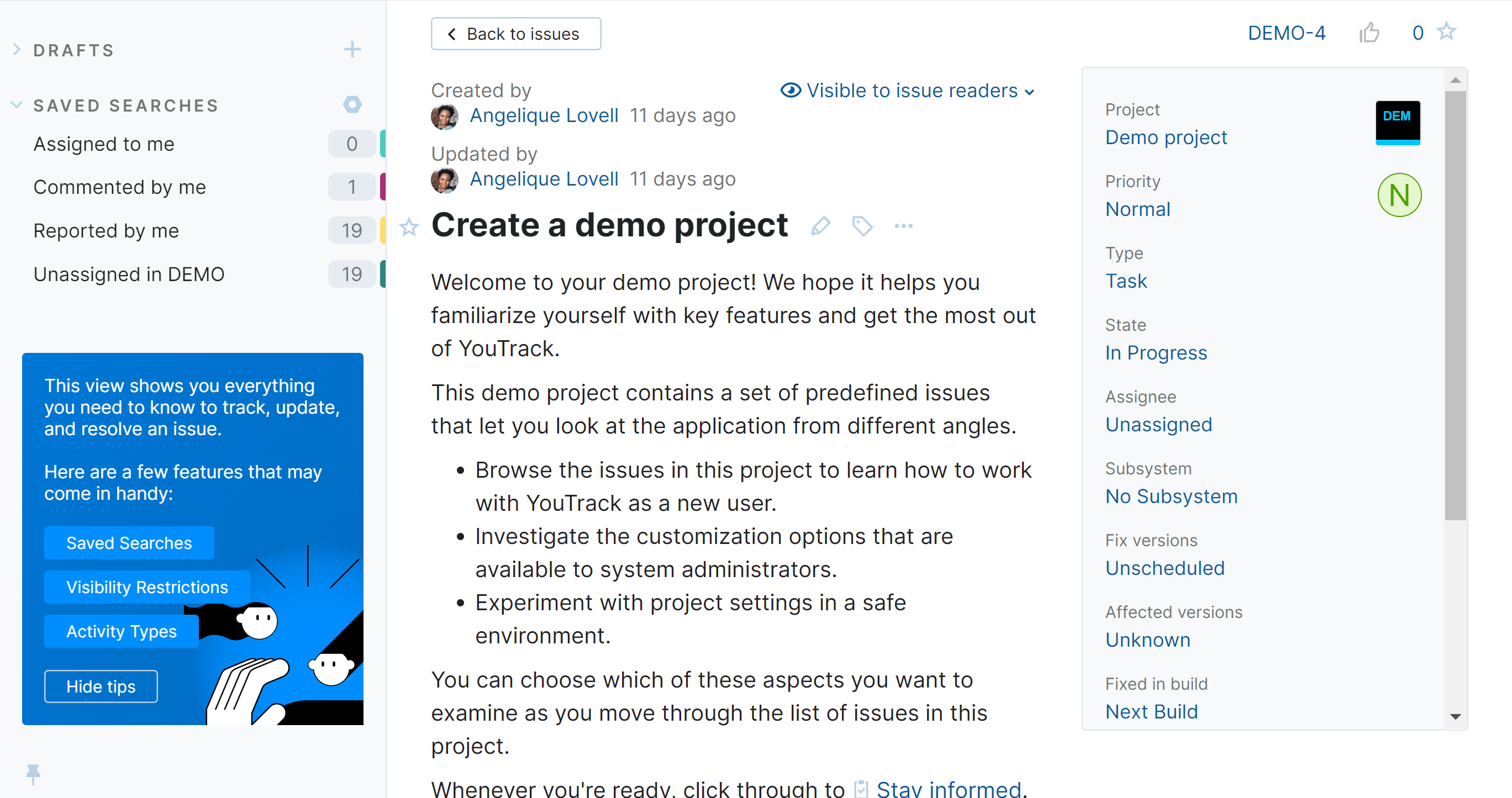 Starting from version 2020.3, YouTrack automatically shows a collection of onboarding tips to newly registered users. These little hints help you find your way around as you start to work with the application. Hints are shown for the Issues list, in single issue view, and on agile boards.