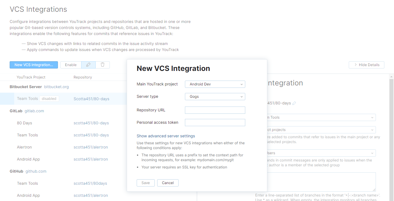 Your YouTrack project is integrated with the selected repository in Gogs.
