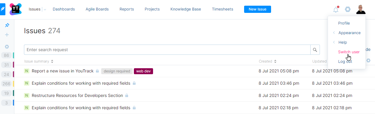 If you have more than one YouTrack account, you can switch between accounts without signing out and back in again.