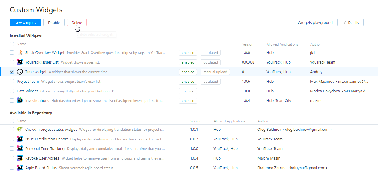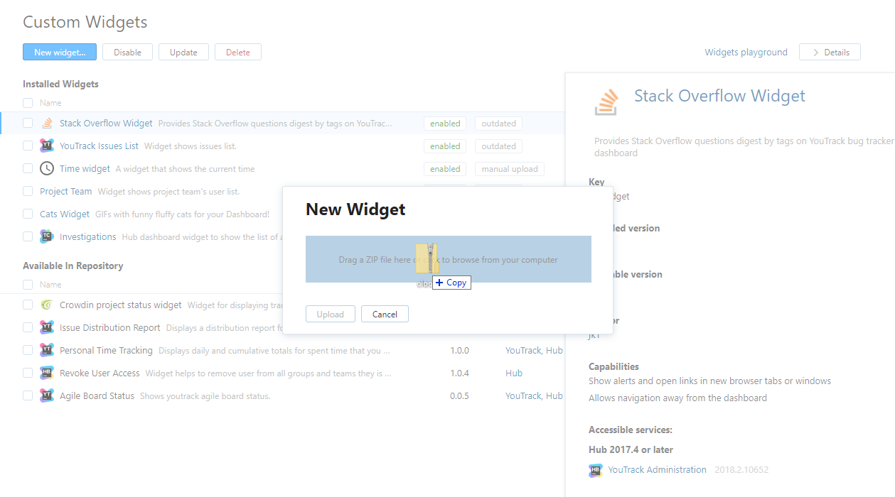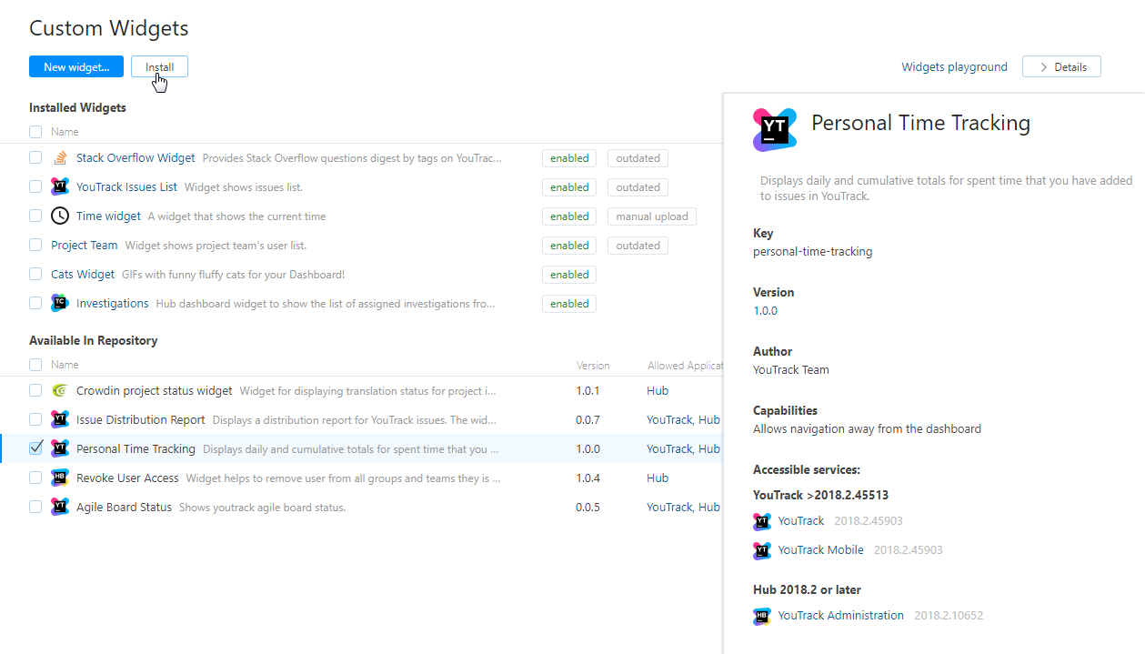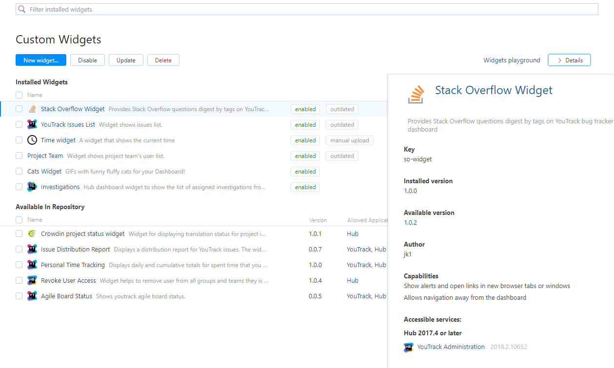 The JetBrains Plugins Repository is integrated directly with YouTrack. This means that you can install widgets from the repository without leaving YouTrack. A list of widgets that are compatible with your YouTrack installation version is shown in the Available from Repository section of the list.
