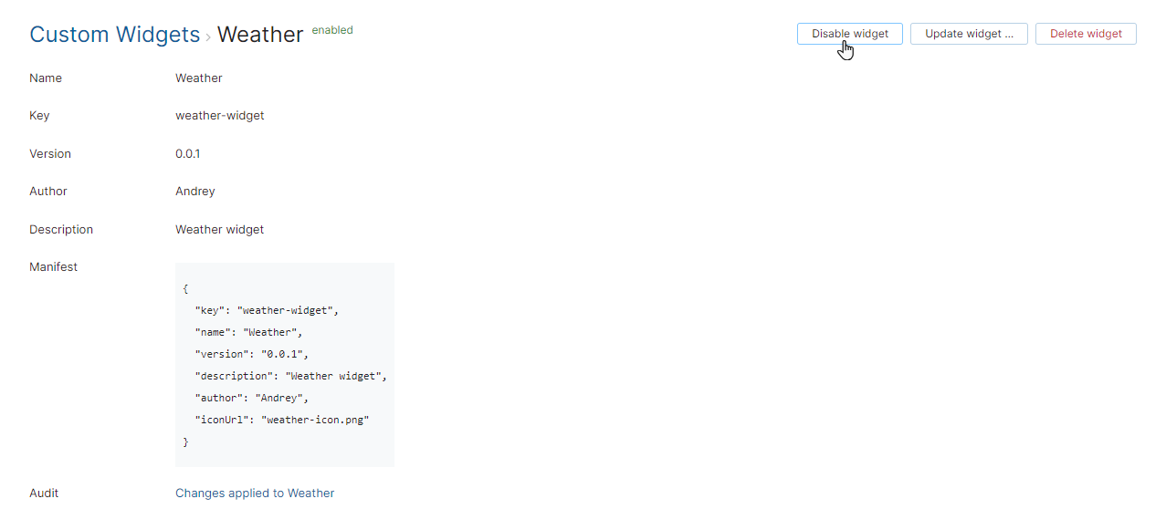 For disabled widgets, the option in the header and widget profile page changes to Enable and Enable widget respectively. Use these controls to reactivate disabled widgets.