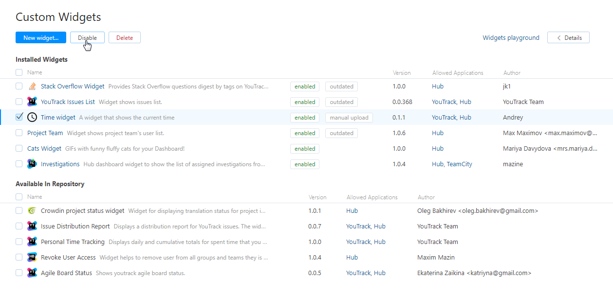 If you no longer want users to work with a custom widget, but don't want to delete it from YouTrack, you can disable the widget indefinitely.