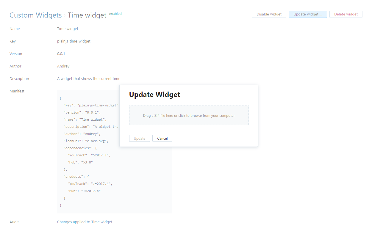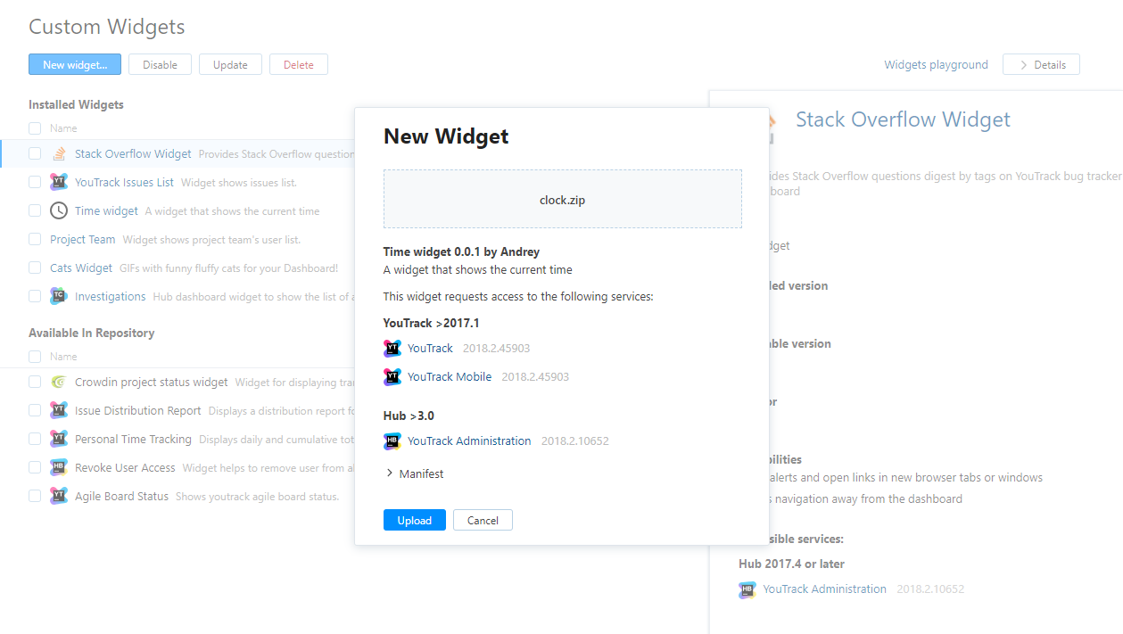 If you want to use a widget that has not been uploaded to the JetBrains Plugins Repository, it must be uploaded manually to YouTrack. You can also use this option to install widgets that you have downloaded from the repository when YouTrack is installed on a private network.