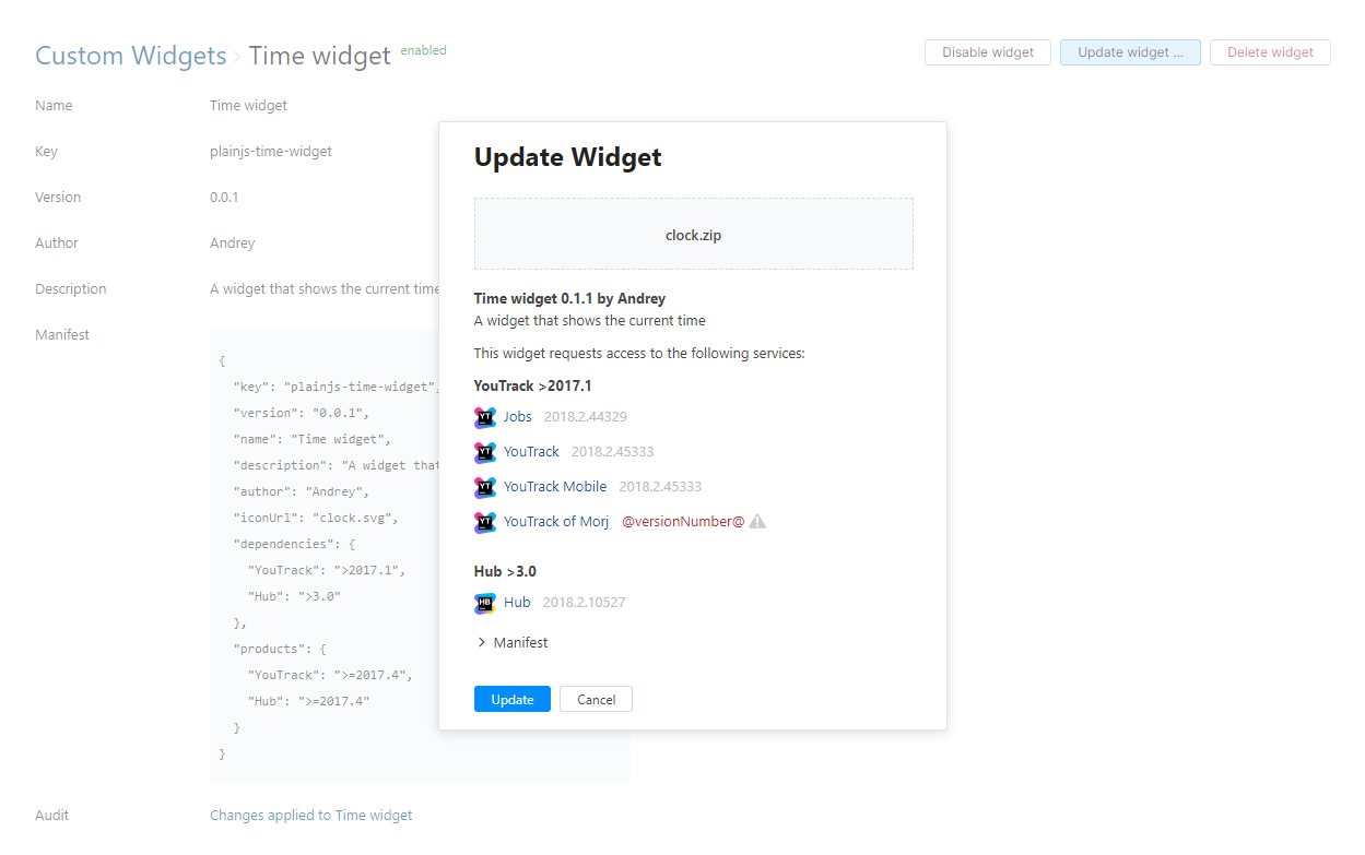 YouTrack displays the attributes that are specified in the widget manifest file. This includes a list of services that are accessed by the widget and the supported versions of each application.