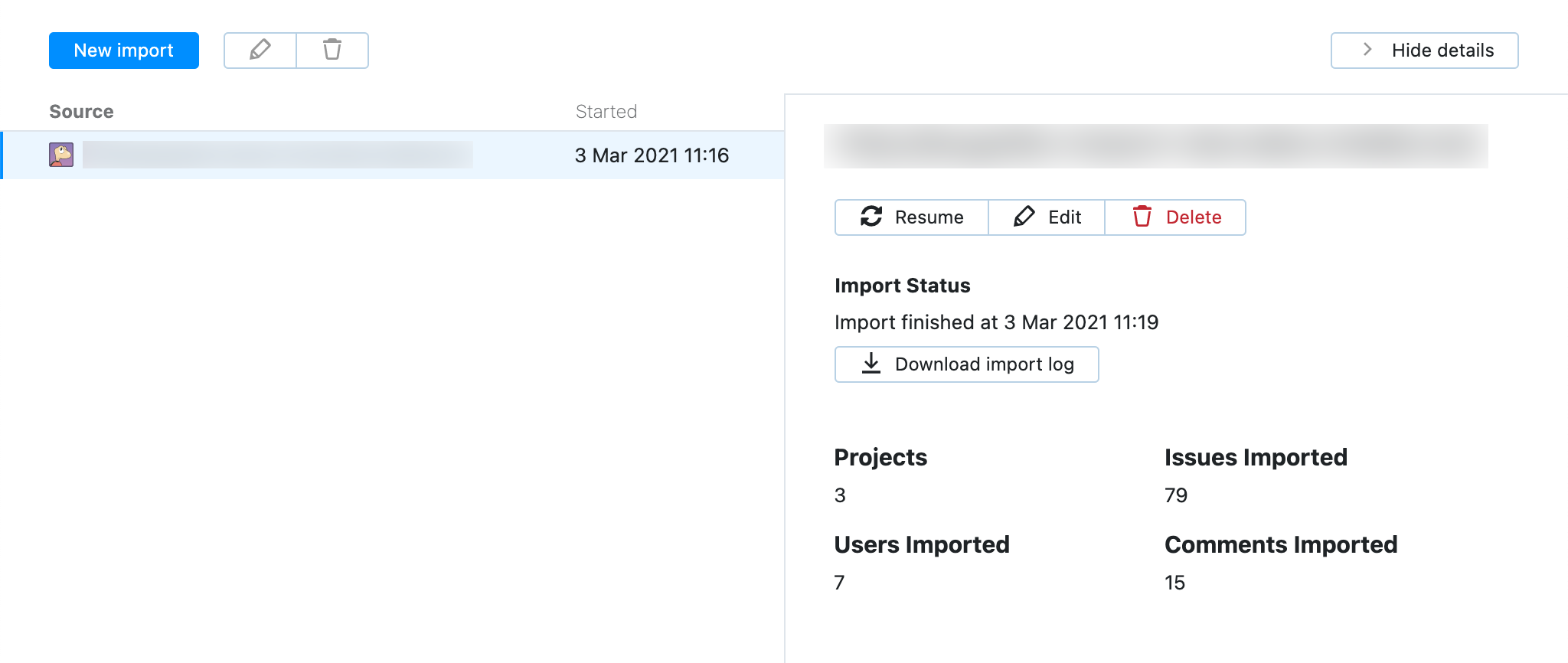 In the details sidebar, YouTrack shows import status and details on the data that was imported.