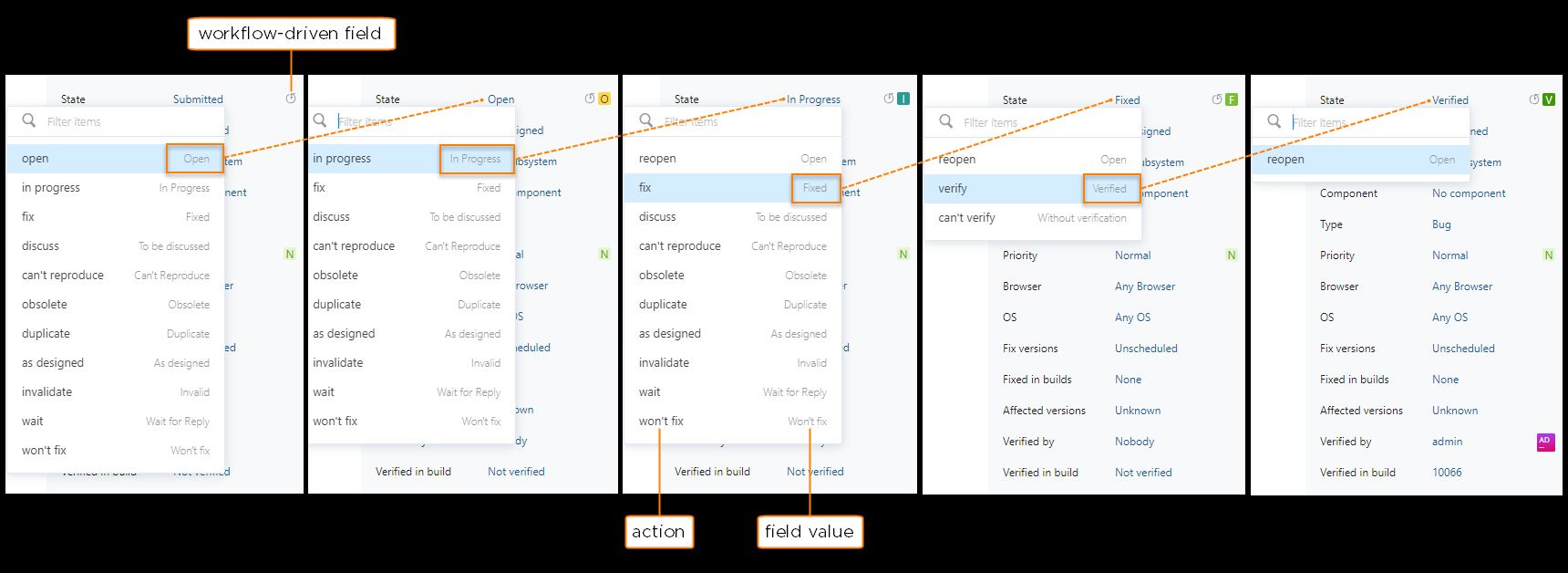 When a state-machine rule is applied to a project, the options that are shown in the drop-down list for the field are restricted to the transitions that are defined in the state-machine rule for the current state. Custom fields that are regulated by a state-machine rule are marked with a Workflow-driven field icon. The action that is defined for each value in the state-machine rule is displayed in the drop-down list. The actual values are shown to the right. The following image illustrates how the list of allowed transitions for the State field changes based on the current value.