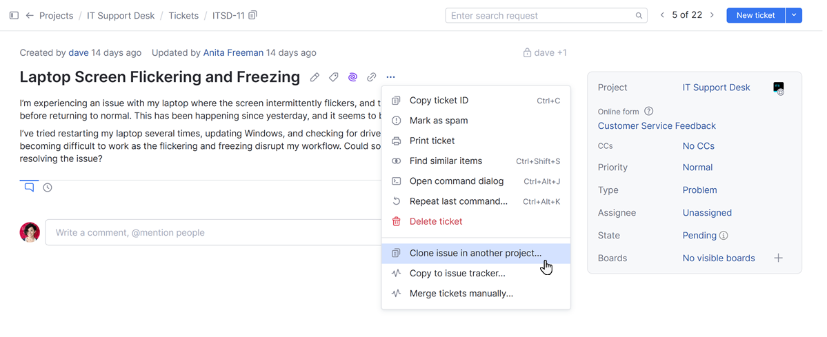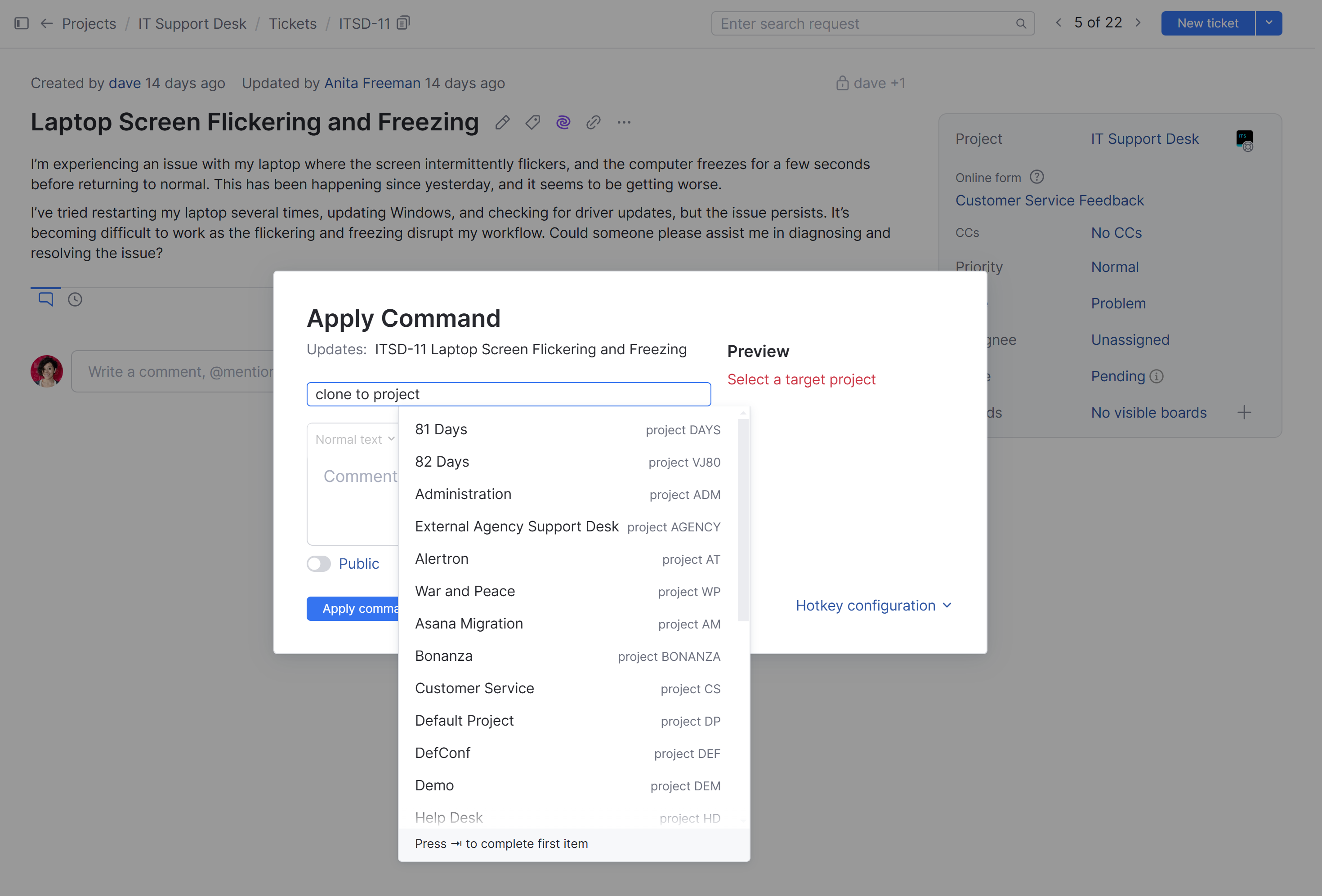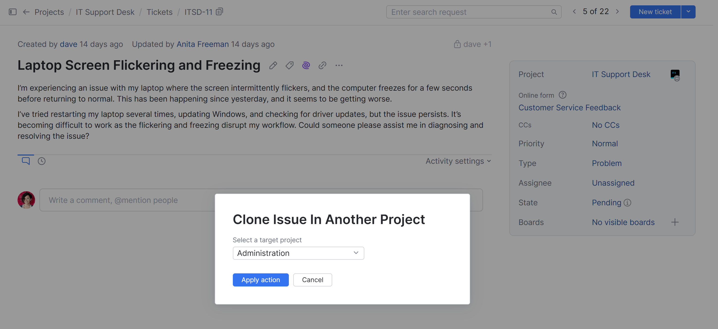 The name that is assigned to the rule, Clone issue to another project, is shown in the action menu for single issues. When a user selects this option from the menu, the actions that are described in this rule are applied to the selected issue.