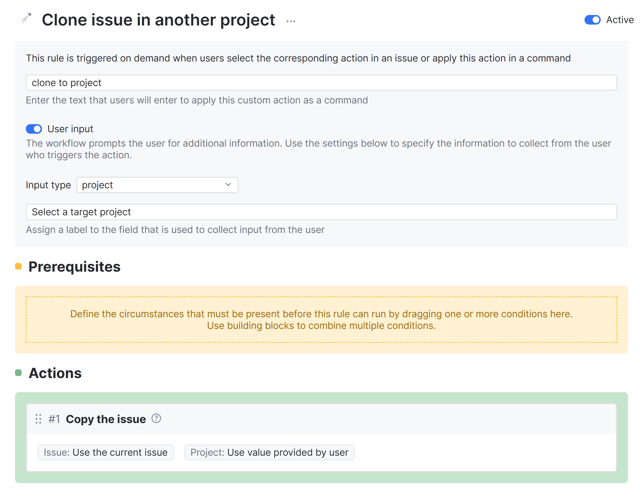 This rule doesn't have any additional preconditions. The option to apply the custom action is available in any issue that belongs to a project where the workflow rule is active.