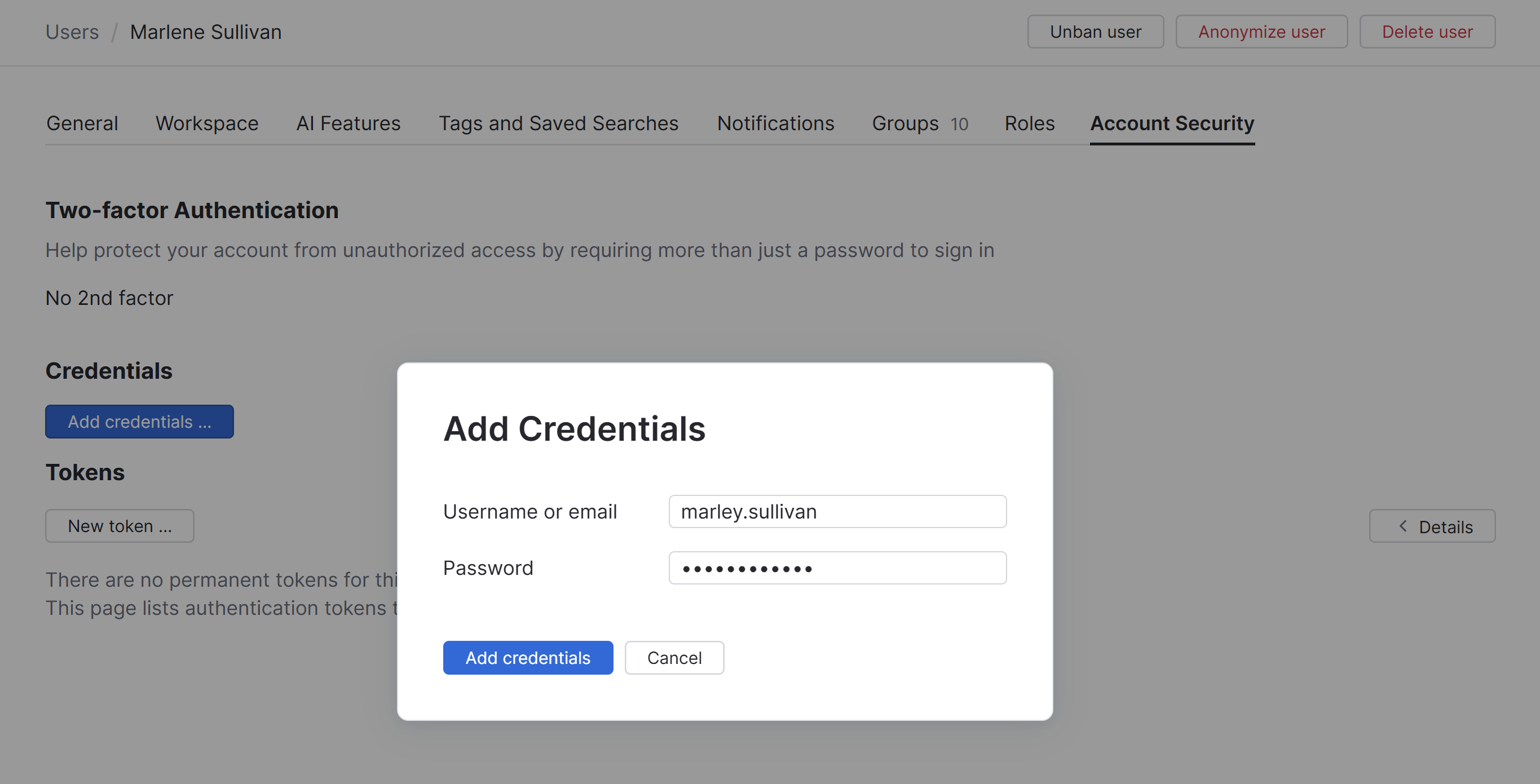 Administrators with the required permissions can add credentials to any user account in the system. Individual users with the Update Self permission can add credentials to their own accounts. For more information, see Add Credentials to Your Account.