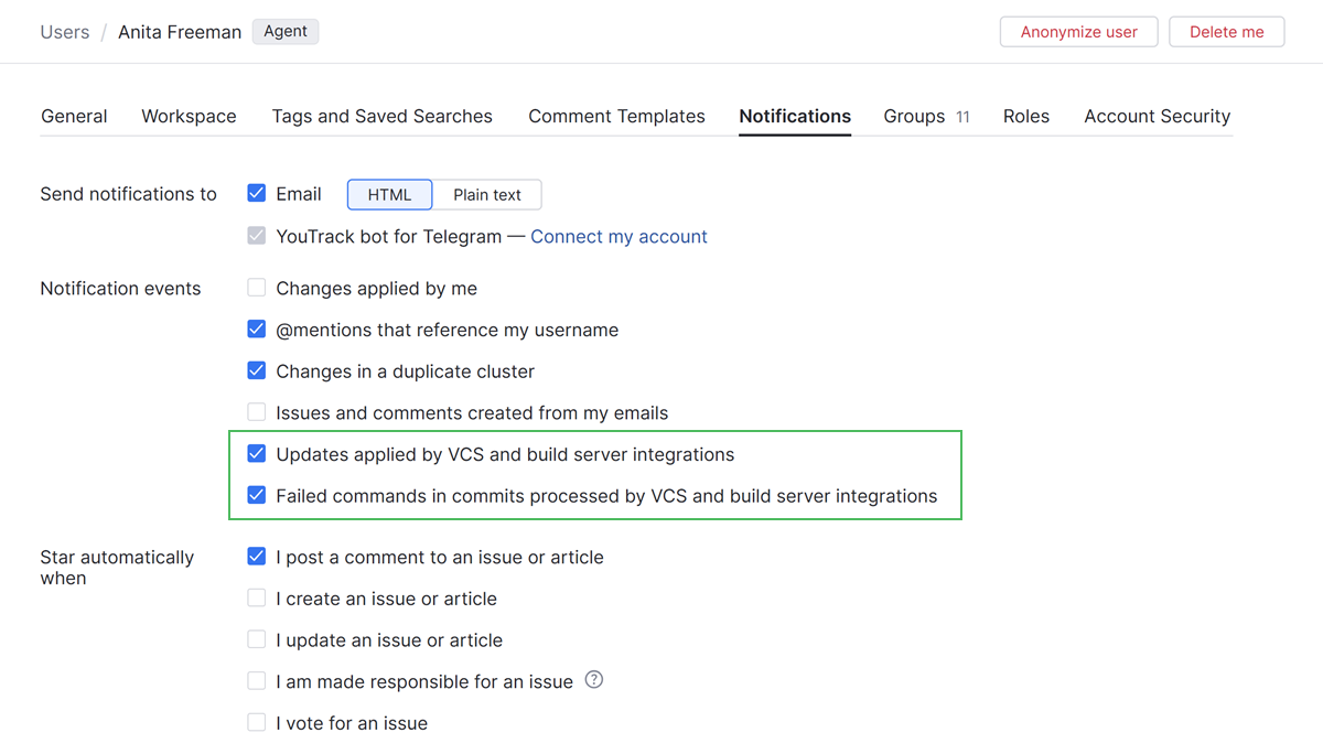 Sends a notification when a command that is entered in a comment in a VCS commit fails to update an issue. This can help you identify users whose VCS usernames aren't properly matched with their YouTrack accounts or recognize invalid command syntax.