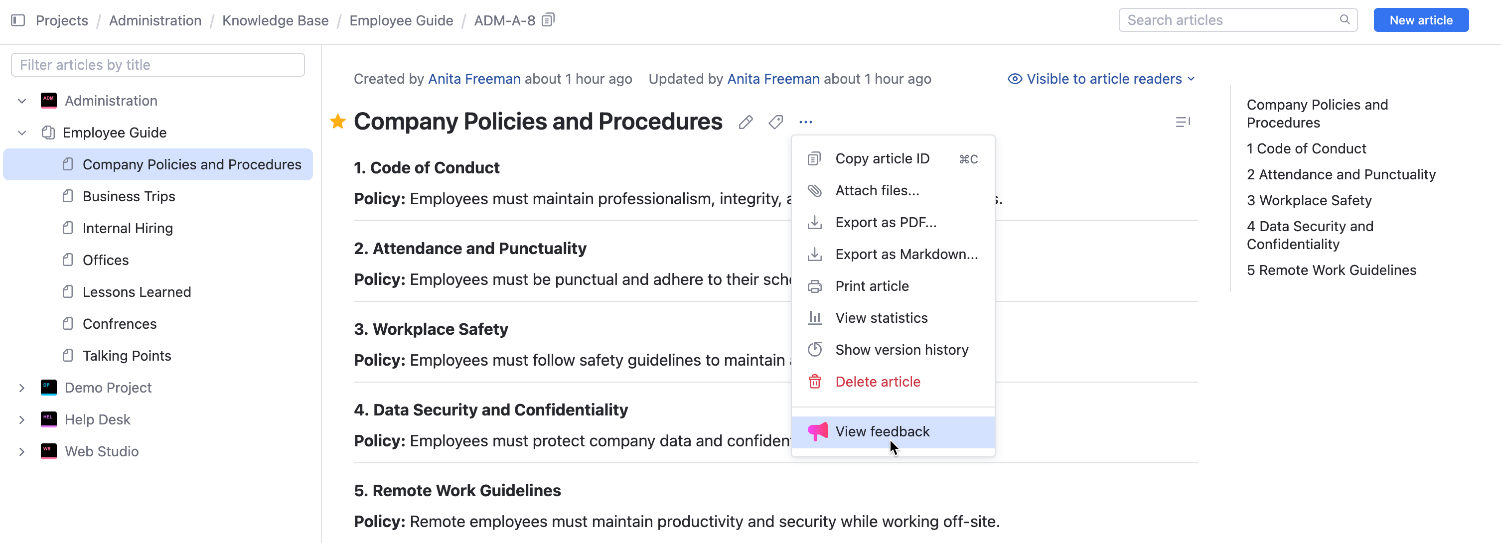After article feedback has been submitted, YouTrack users with access to the knowledge base and the permission Update Article can view the feedback.