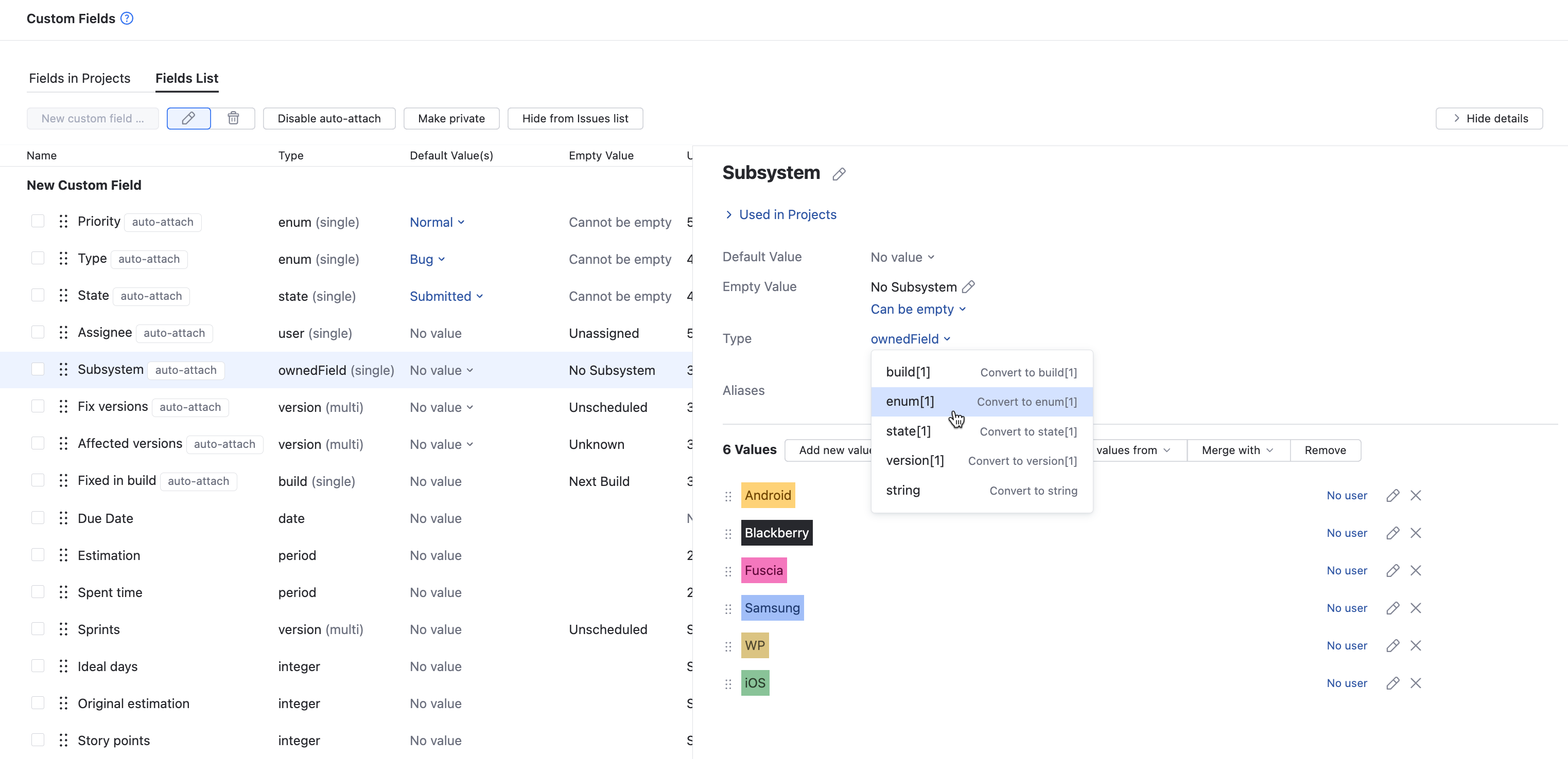 You can convert an issue field type to another type that stores similar data. The following field type conversions are supported: