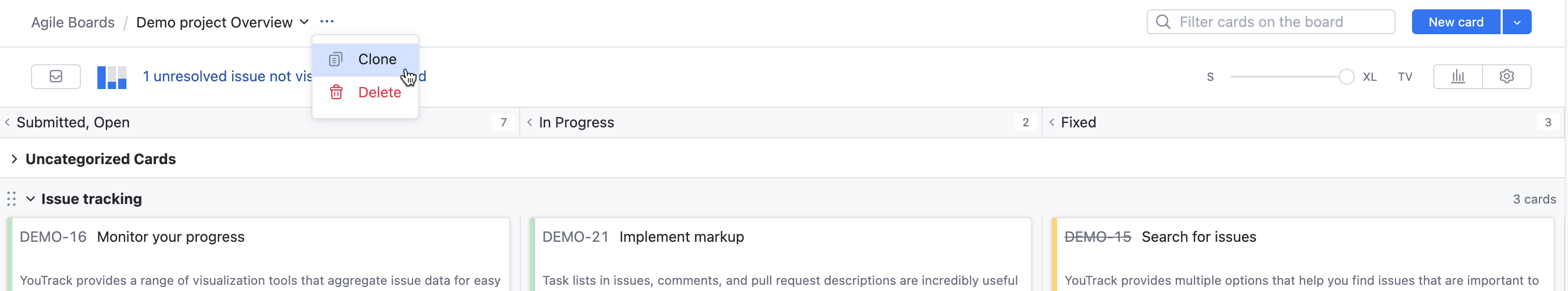 The Clone operation lets you create a new agile board without having to configure it from scratch. Once you have cloned an agile board, you can edit the settings for the cloned board independently from the original board.