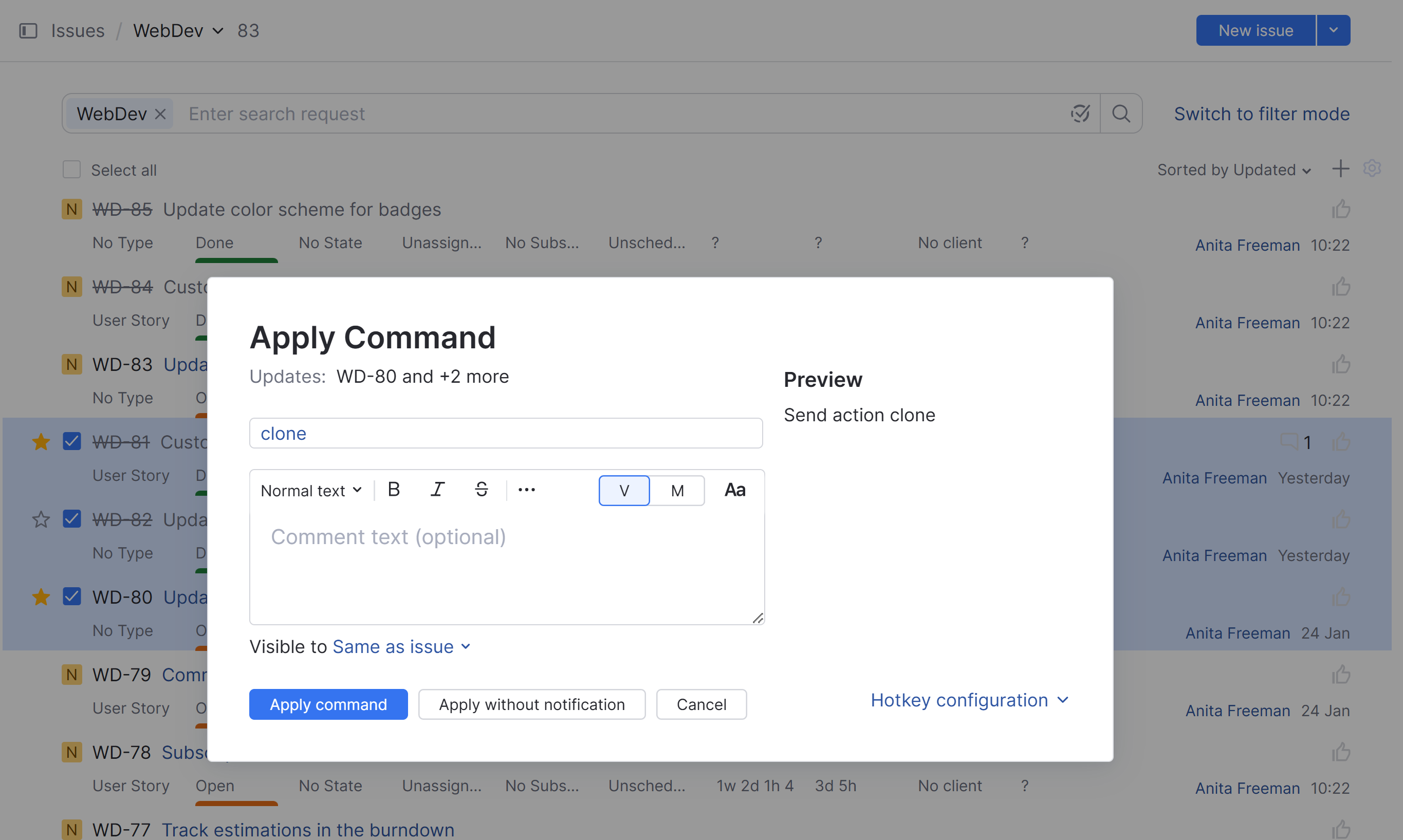If you work with recurring projects or want to maintain the structured relationships between a set of tasks, you might find it helpful to clone multiple issues at once.