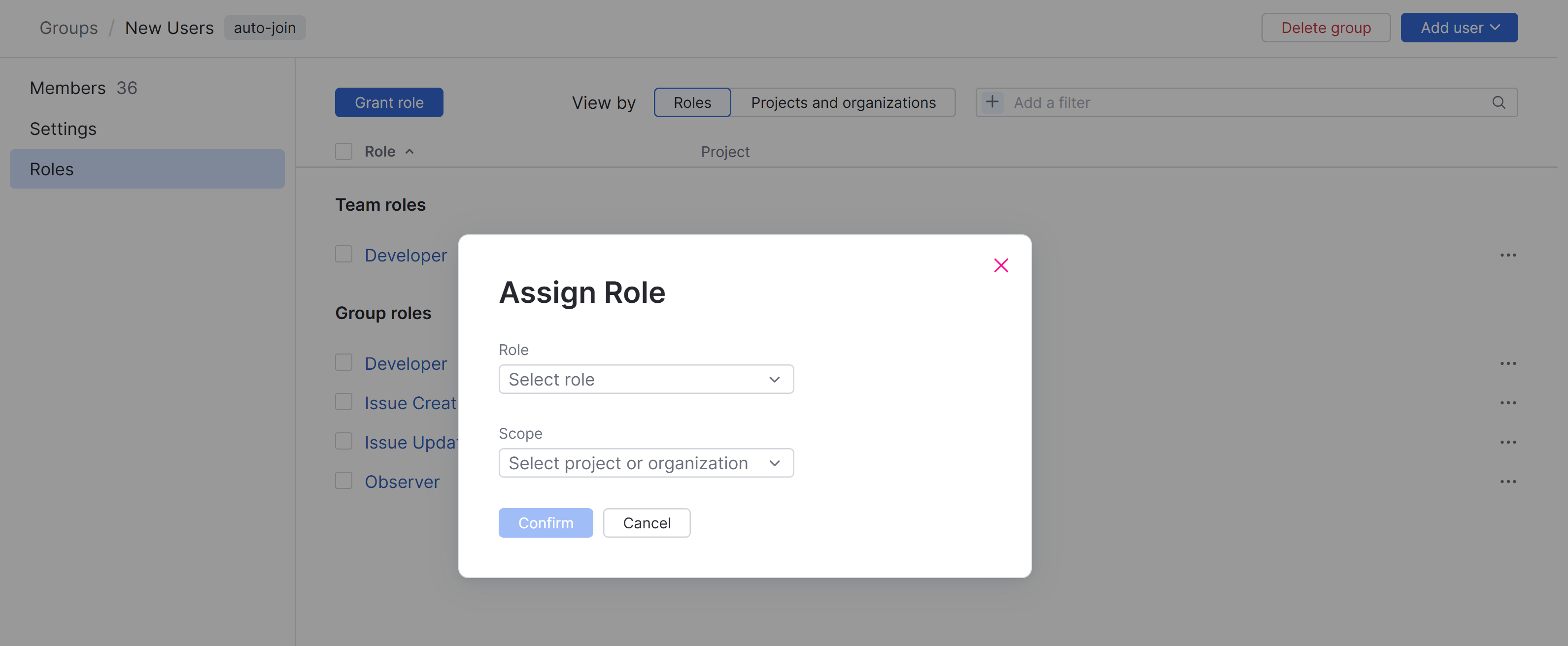 The Roles page in the group profile lets you view and manage the permissions that are available to the members of a group. It provides a centralized view of available roles, their scope, and the projects or organizations where they apply. Group members inherit permissions based on the roles that are assigned to the group in one or more projects.