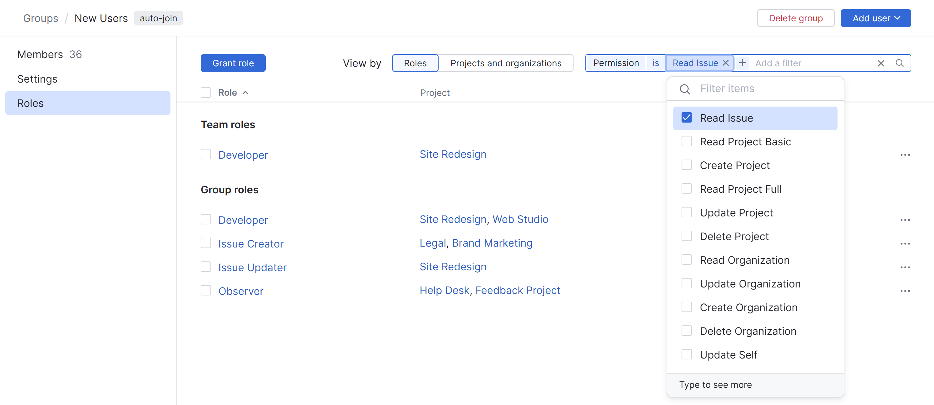 4. Use the search box to filter the list by a role, project, or even a particular permission to find out if the group has the required access to a resource or operation.