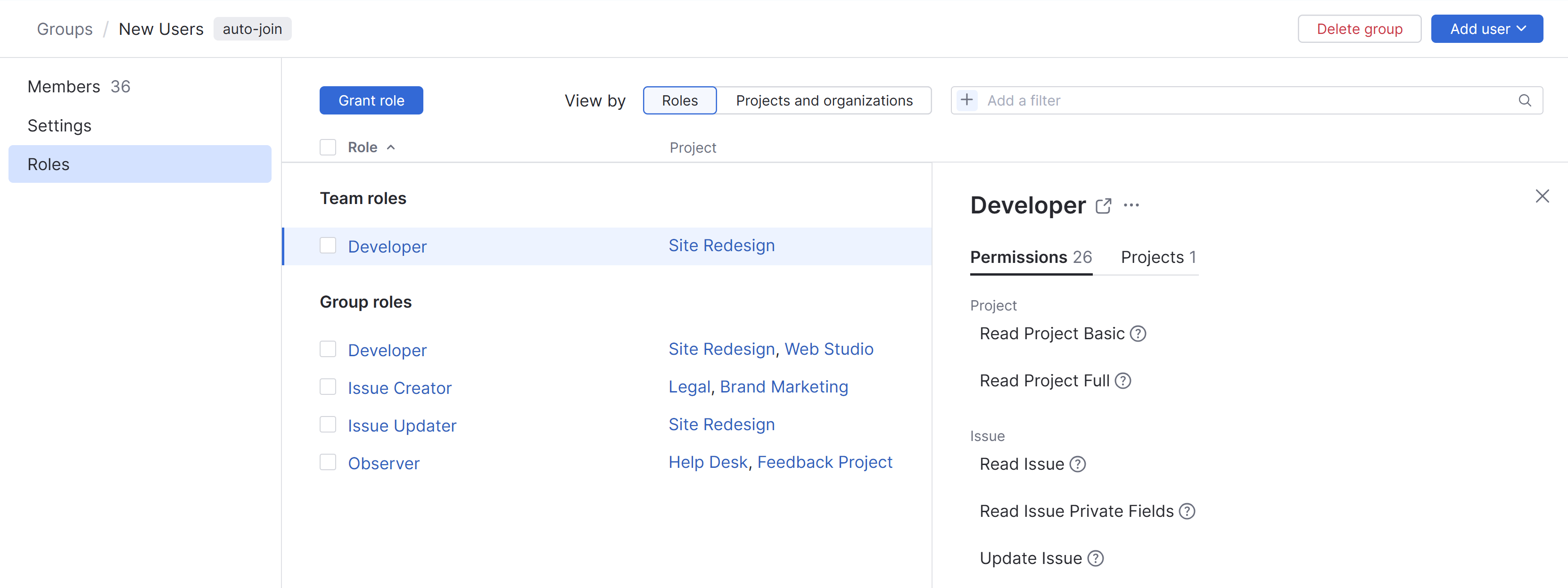 • The list displays each role assigned to the group and the projects in which the group is granted this level of access.