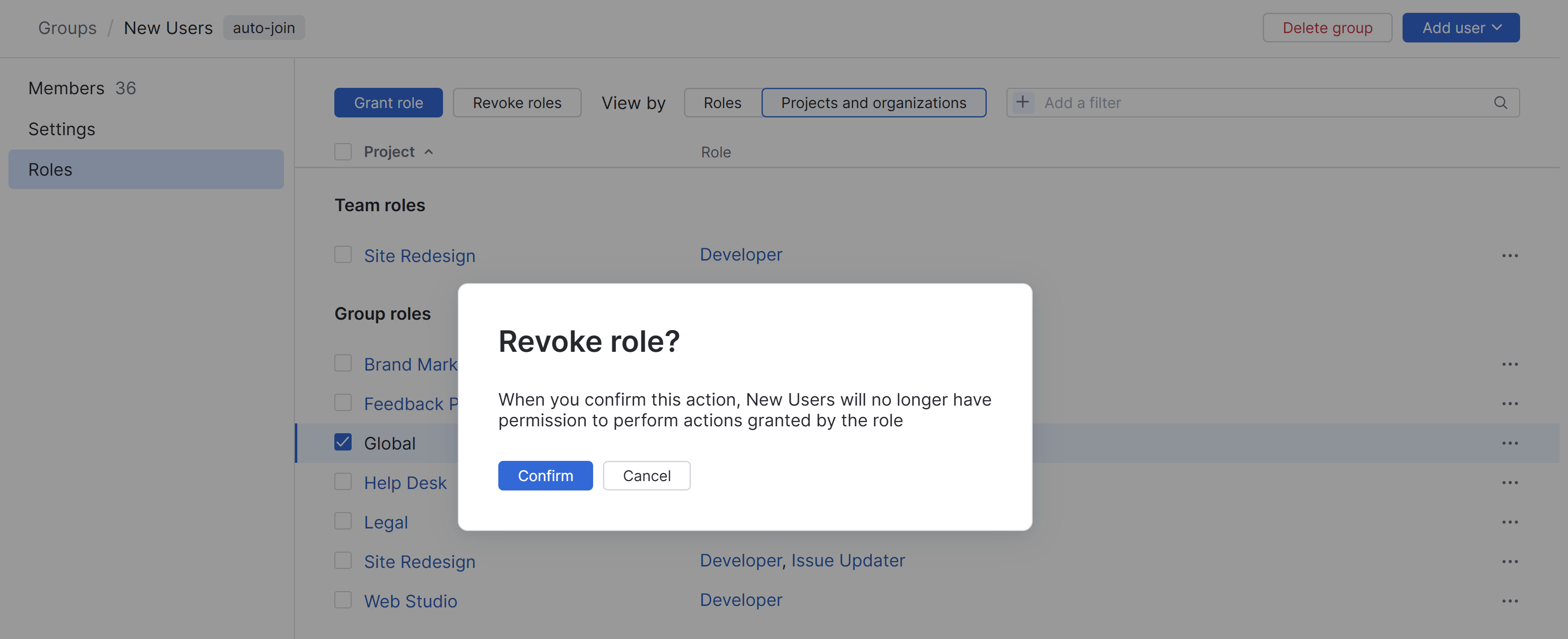• When viewing the list by Projects and organizations, you can choose specific scopes where the role is revoked.
