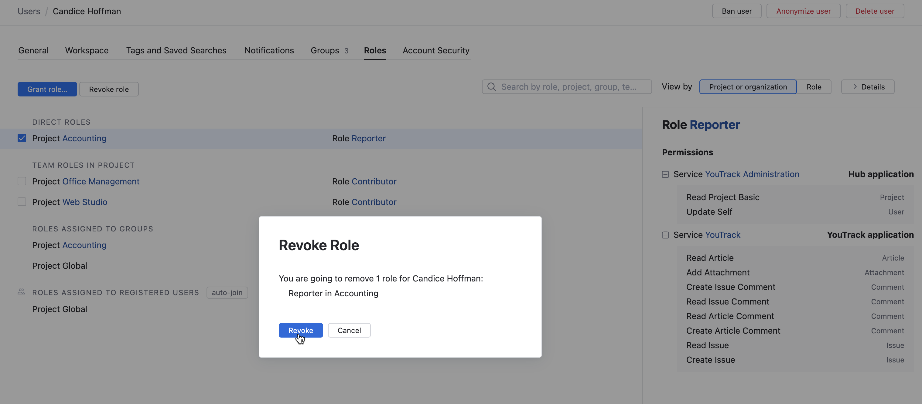 • If a role is granted to a user as a member of a project team, you can revoke the role assignment by removing the user from the project team. For more information, see Remove Users from the Project Team.