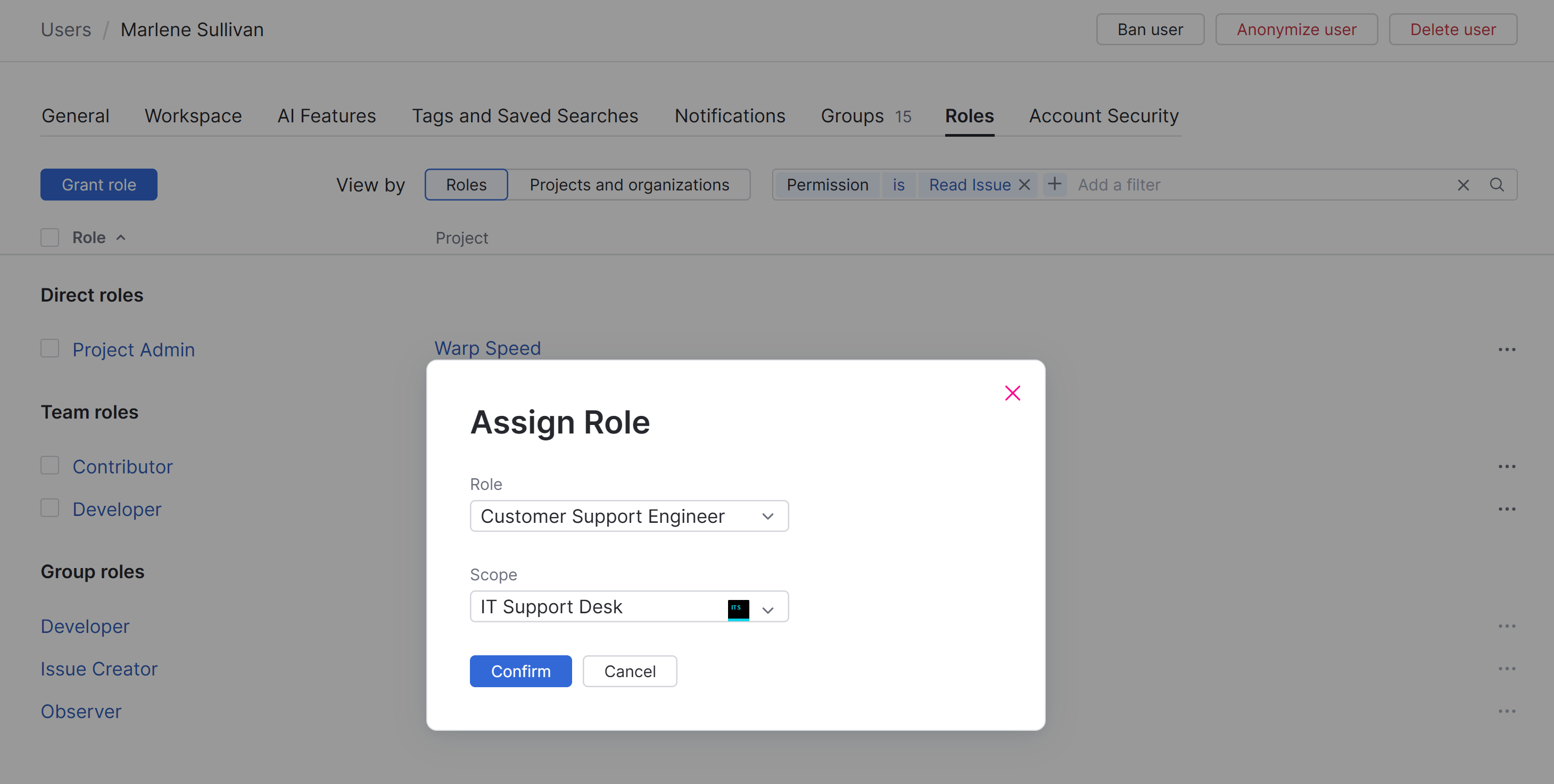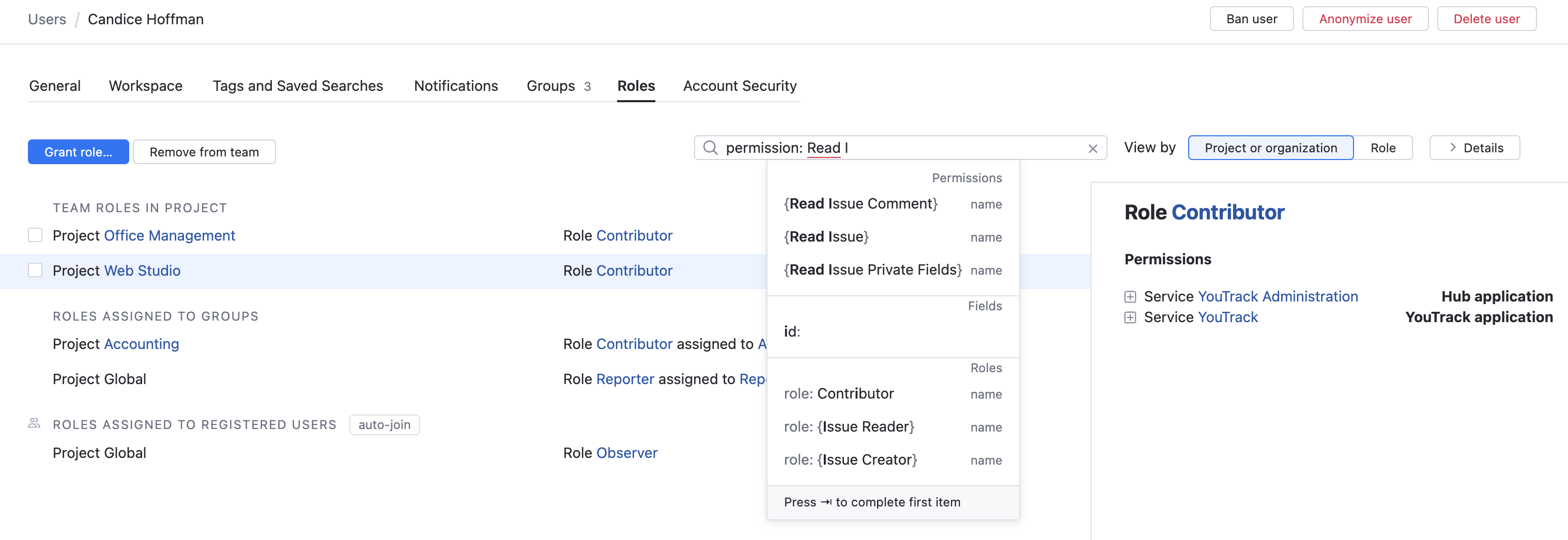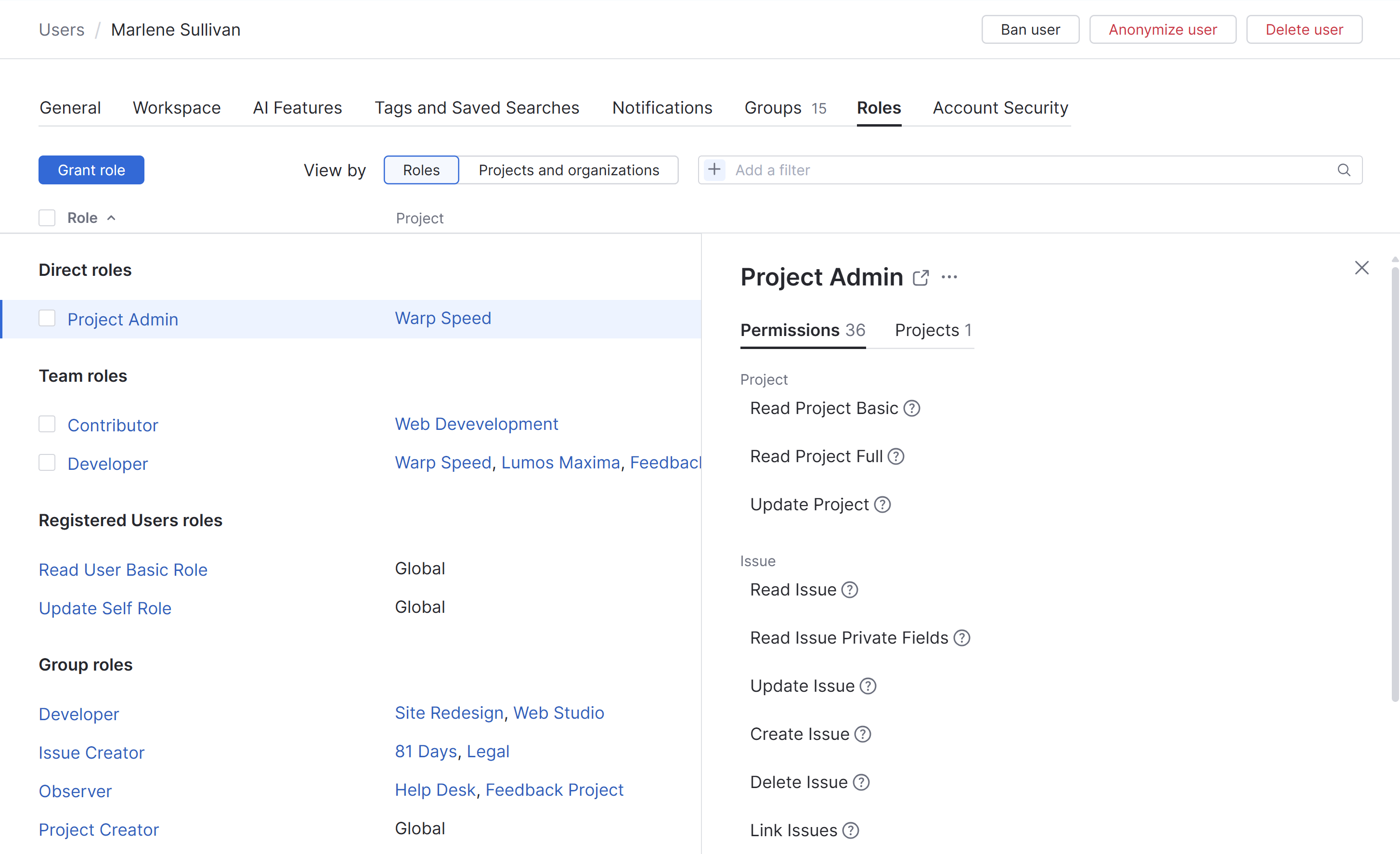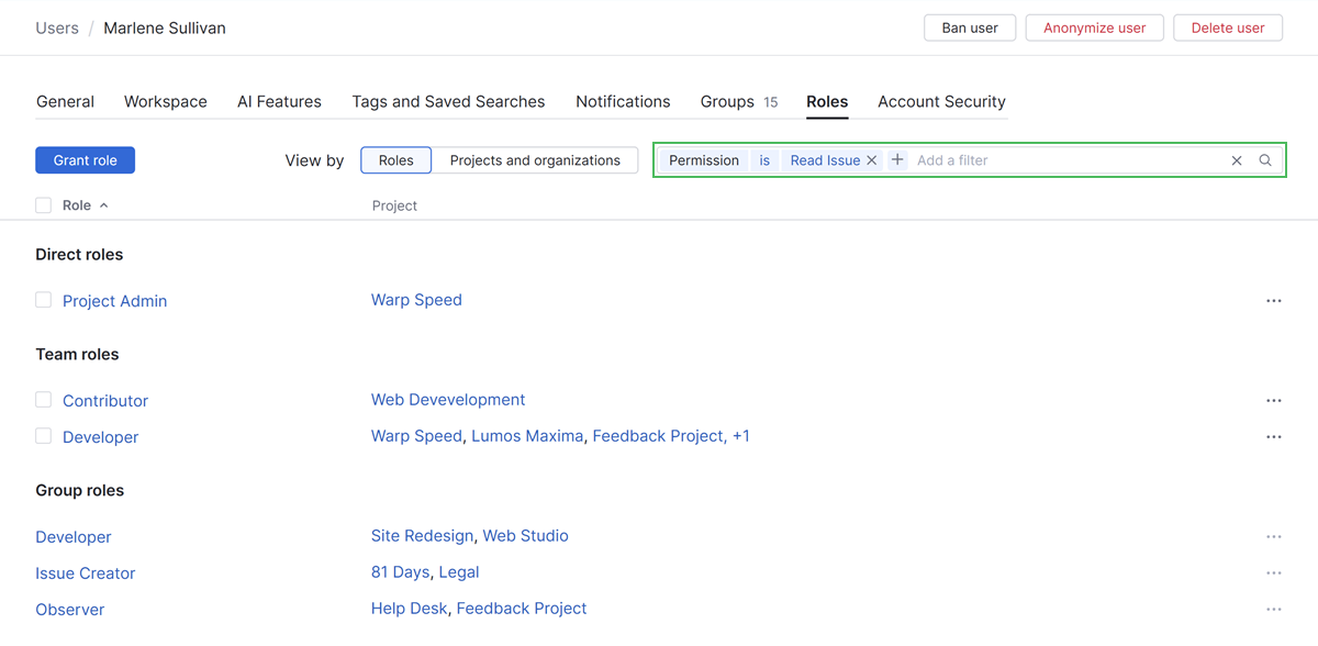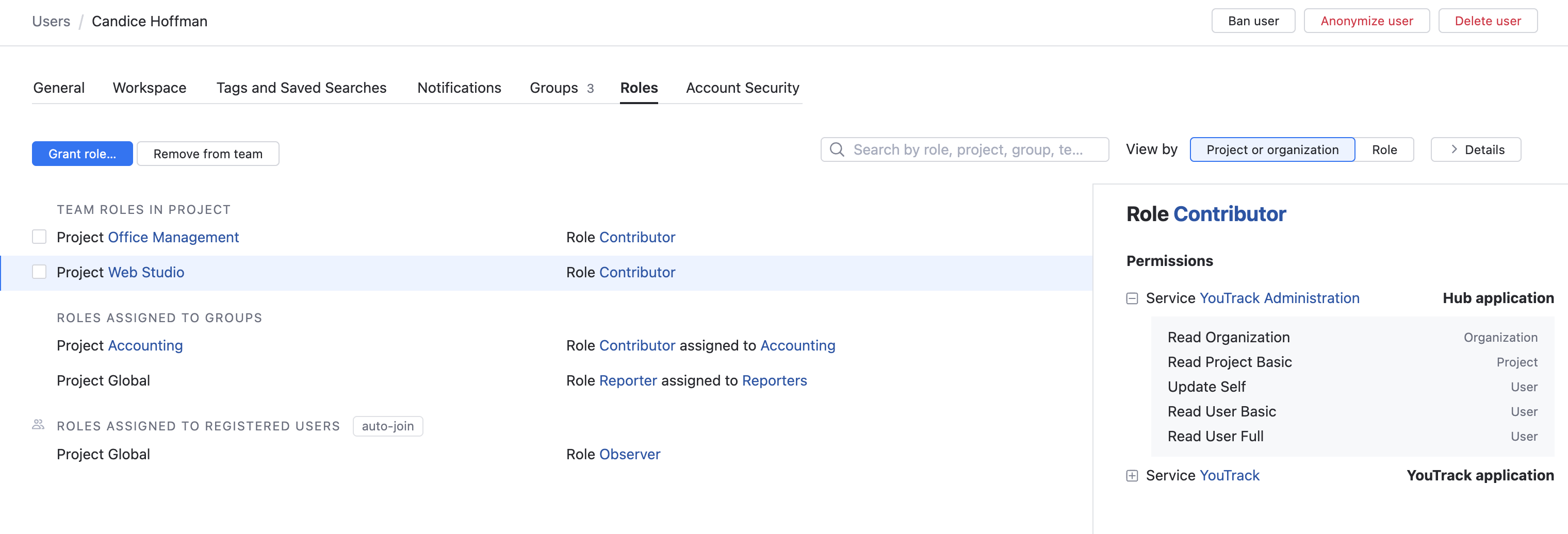 The Roles tab lets you view and manage the permissions that are available to a single user account. Users are granted permissions based on the roles that they are assigned in one or more projects.