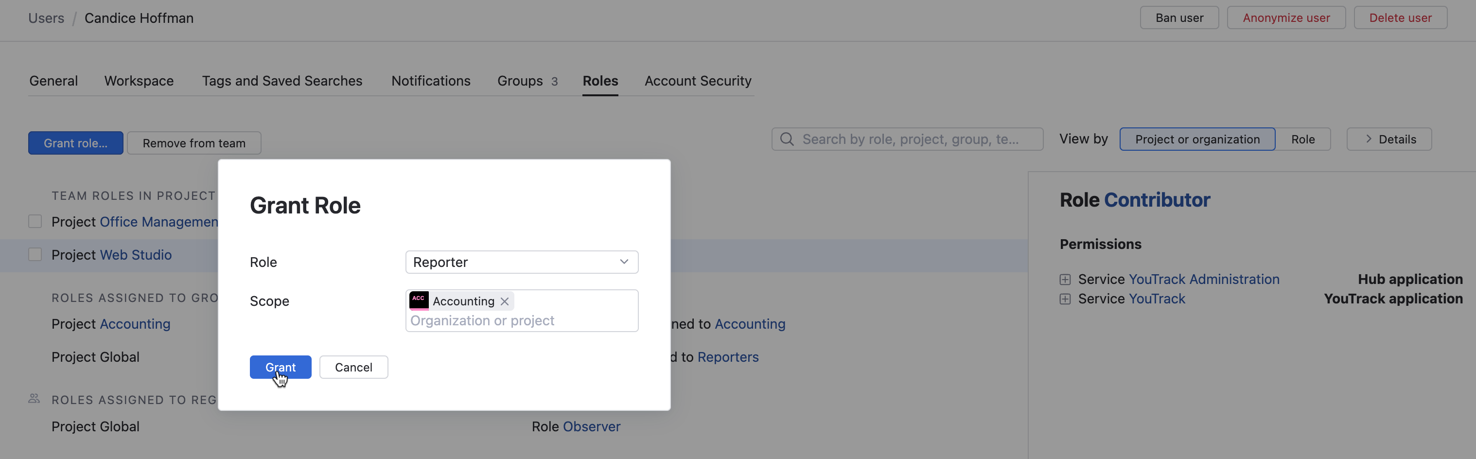 6. In the Grant Role dialog, choose a role to assign to the user.