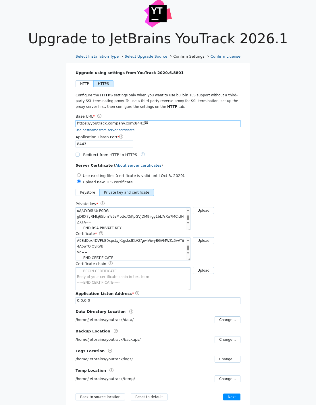 If built-in TLS was enabled for your installation but the server certificate or keystore is invalid or expiring, you can upload a new one during upgrade.