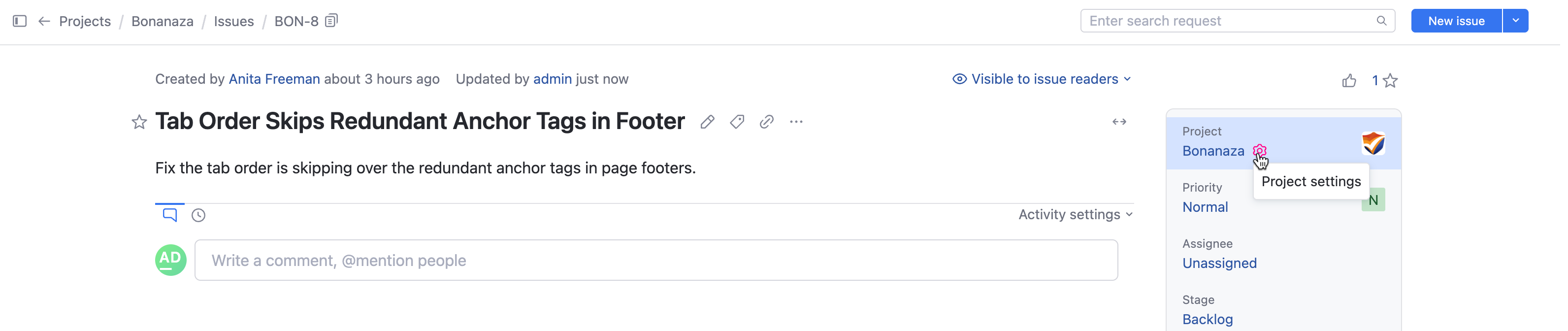 YouTrack projects are highly customizable. To help you make sure that your project supports your team's needs and business logic, you can access the project settings from various locations in the user interface. These navigation options are only visible to users who have Update Project permissions in the project.