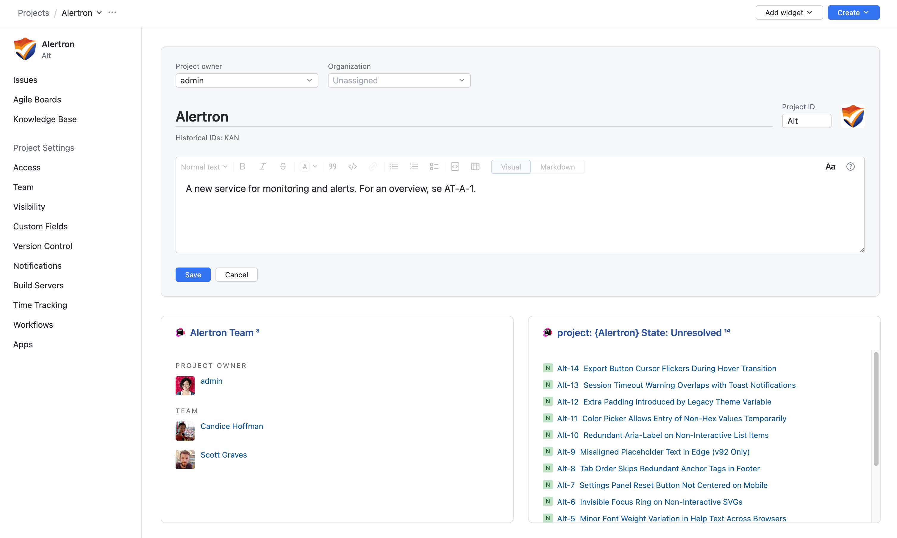 The rich text editor lets you format the project description text in Visual or Markdown mode.