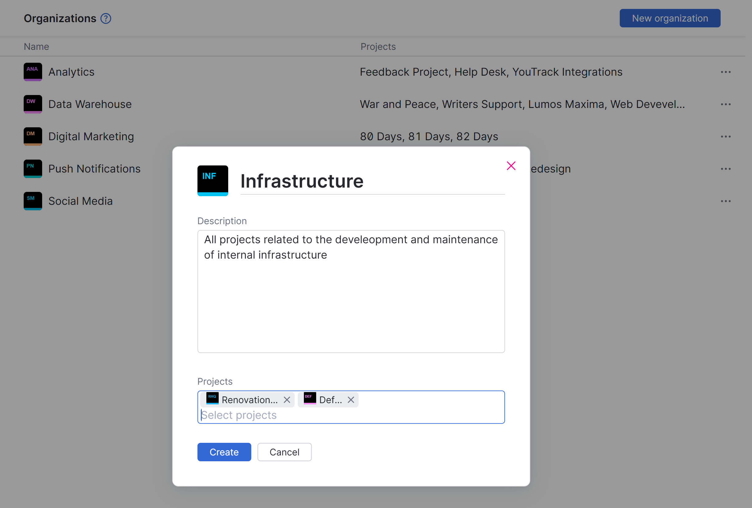3. In the New Organization dialog, enter a name and an optional description for the organization.