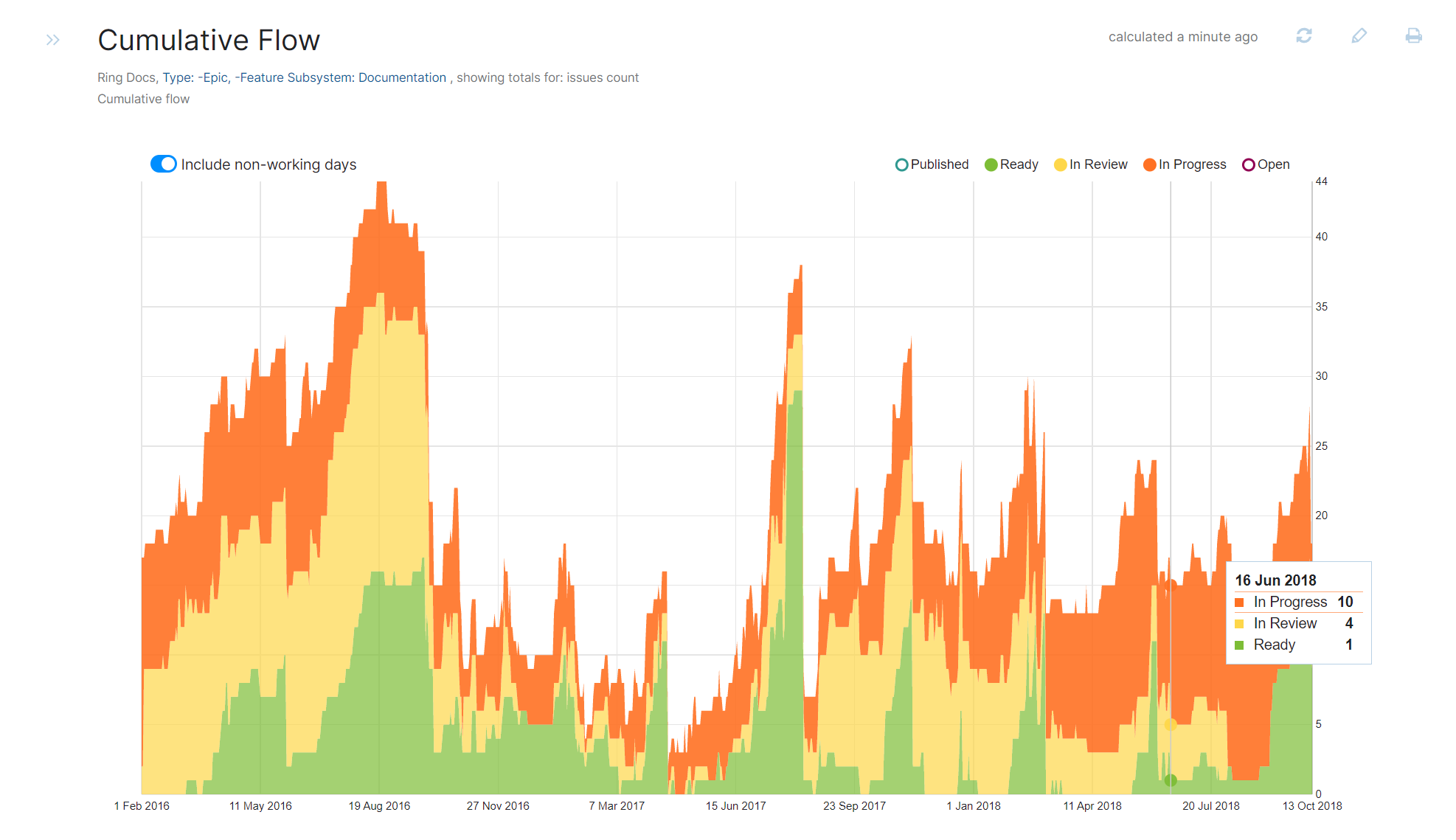 Shows the distribution of values that are used in a custom field for issues over a period of time. Unlike the cumulative flow chart for an agile board, this report can include several projects or iterations and can reference values in any custom field.