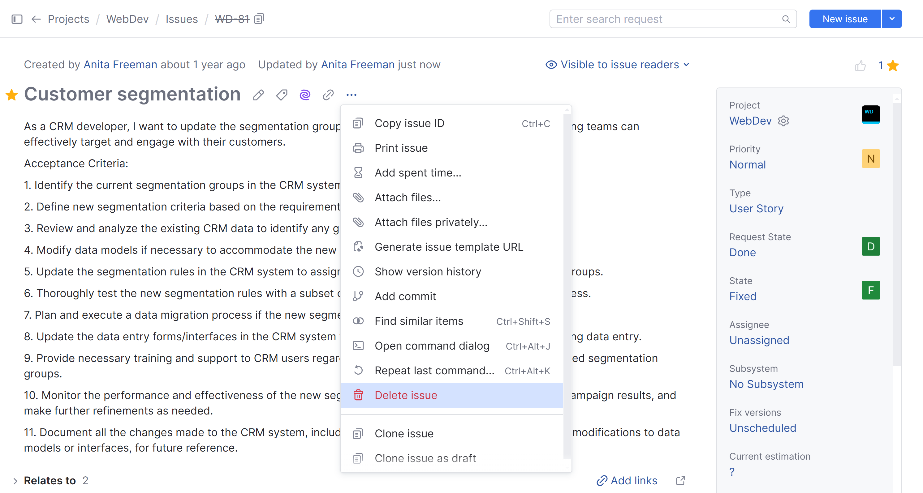 Delete issue option from the menu.