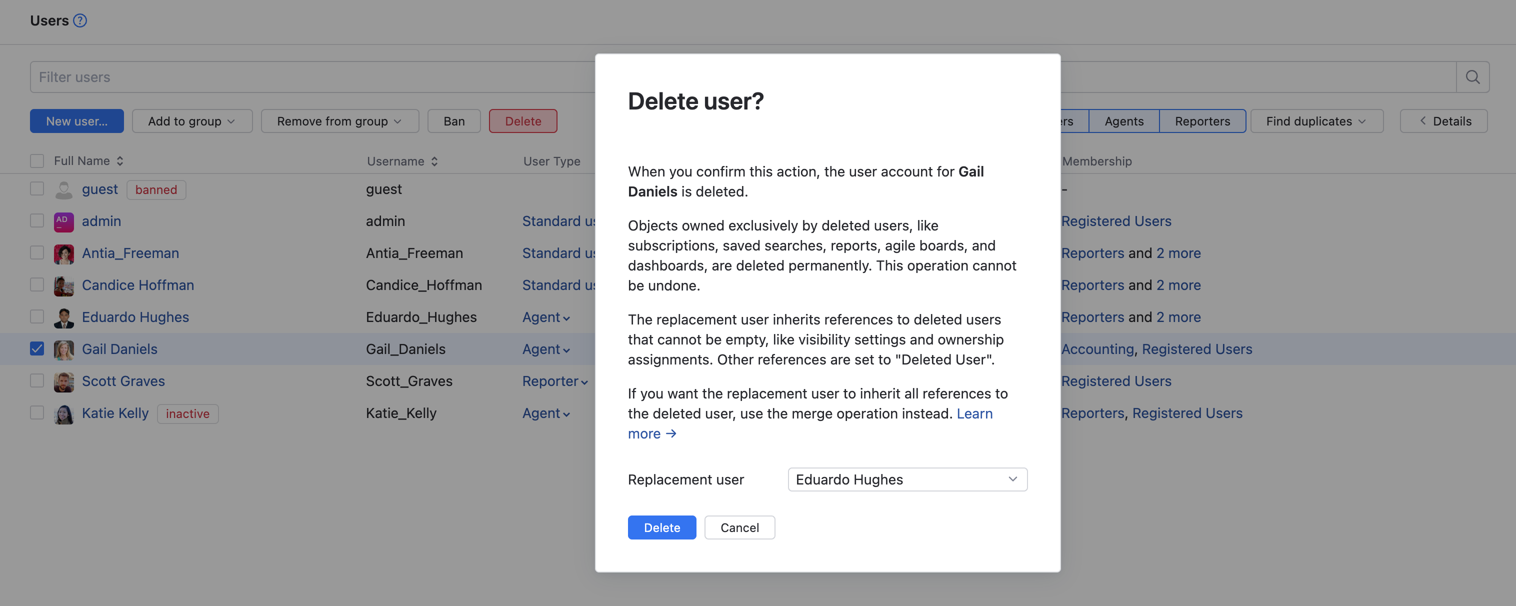 • The replacement user inherits ownership for shared tags, saved searches, reports, and agile boards that were set to the deleted users.